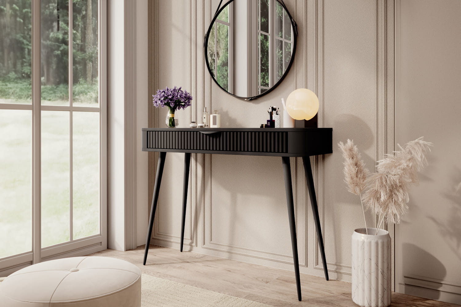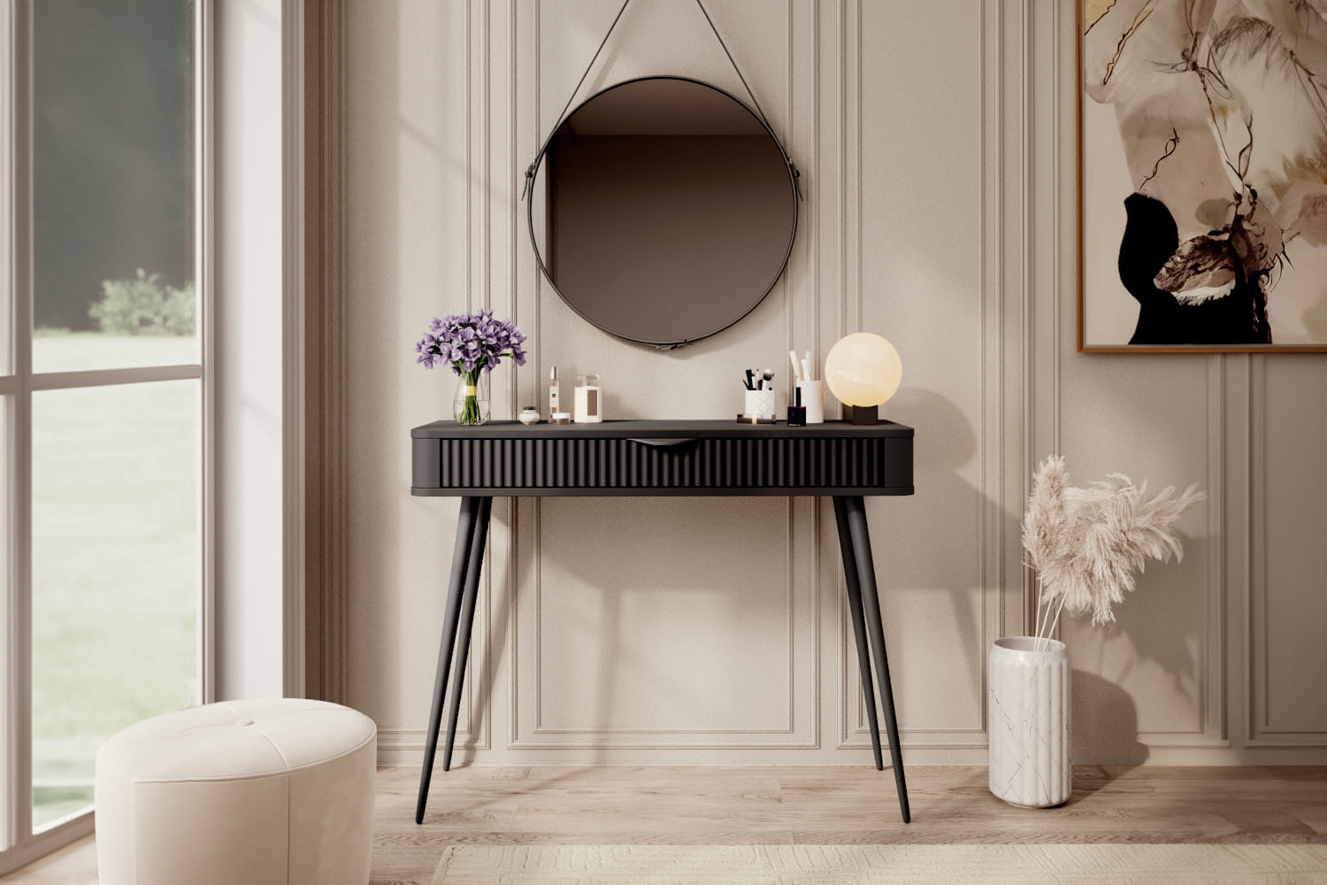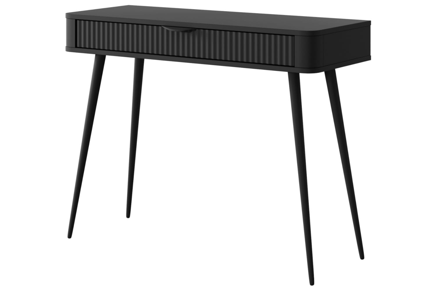 Toaletka/konsolka Adelante w eleganckiej, czarnej wersji to propozycja dla osób ceniących wyrafinowaną prostotę i nowoczesny styl. Cała wykonana w głębokiej czerni – od laminowanego blatu, przez ryflowany front szuflady, po smukłe nogi i uchwyt – tworzy harmonijną, monochromatyczną całość. Czarne wykończenie nadaje jej minimalistyczny, a zarazem luksusowy charakter, doskonale komponujący się z nowoczesnymi i industrialnymi wnętrzami. Praktyczna szuflada na całej szerokości zapewnia funkcjonalność, a elegancka forma czyni z Adelante nie tylko użytkowy mebel, ale i wyrazisty element dekoracyjny.