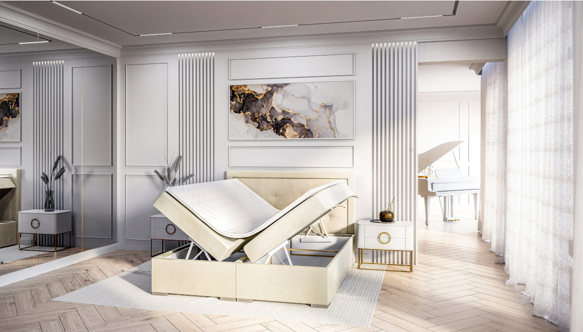 Łóżko boxspring z pojemnikami na pościel VERI