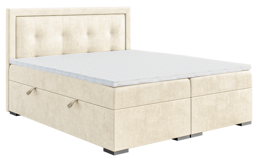W przypadku VERI postawiono na bogato zdobiony zagłówek. Znajdziesz tu symetryczne przeszycia urozmaicone guzikami pod kolor tkaniny obiciowej. W zależności od rozmiaru boxspring oferuje jeden lub dwa pojemniki na pościel. Automaty ułatwiające otwieranie pozwolą na łatwe unoszenie materacy. W standardowym wyposażeniu znajdziesz sprężyny bonellowe z warstwą wierzchnią w formie toppera. Jeżeli pragniesz podnieść komfort użytkowania, rozważ opcję materaca ze sprężyną pocket ,który oferuje lepszą elastyczność punktową. Odpowiedni kolor tkaniny wybierzesz spośród starannie wyselekcjonowanych, modnych propozycji.