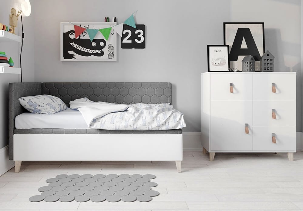 Łóżko tapicerowane z pojemnikiem na pościel 90x200 VIGO SOLO w dwóch kolorach tkaniny pozwoli wprowadzić do pokoju młodzieżowego indywidualny styl. Miękkie zagłówki sprawią, że całe pomieszczenie staje się bardziej przytulne.