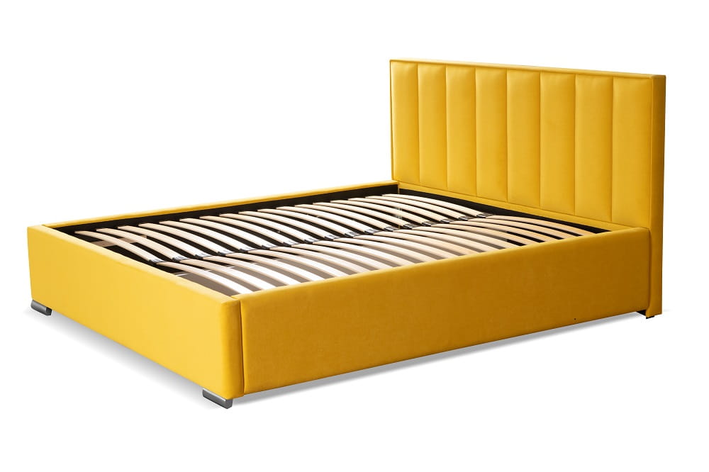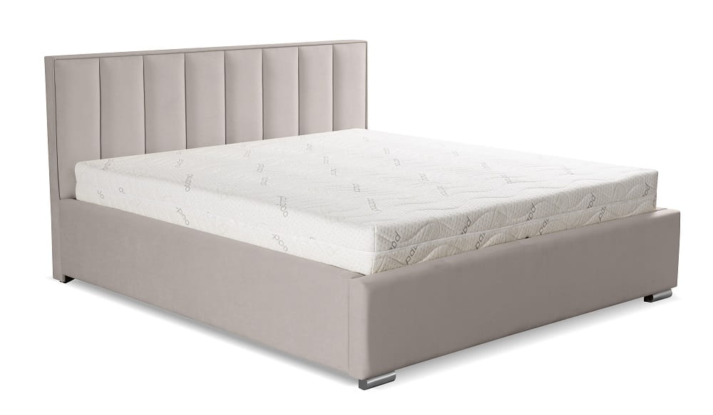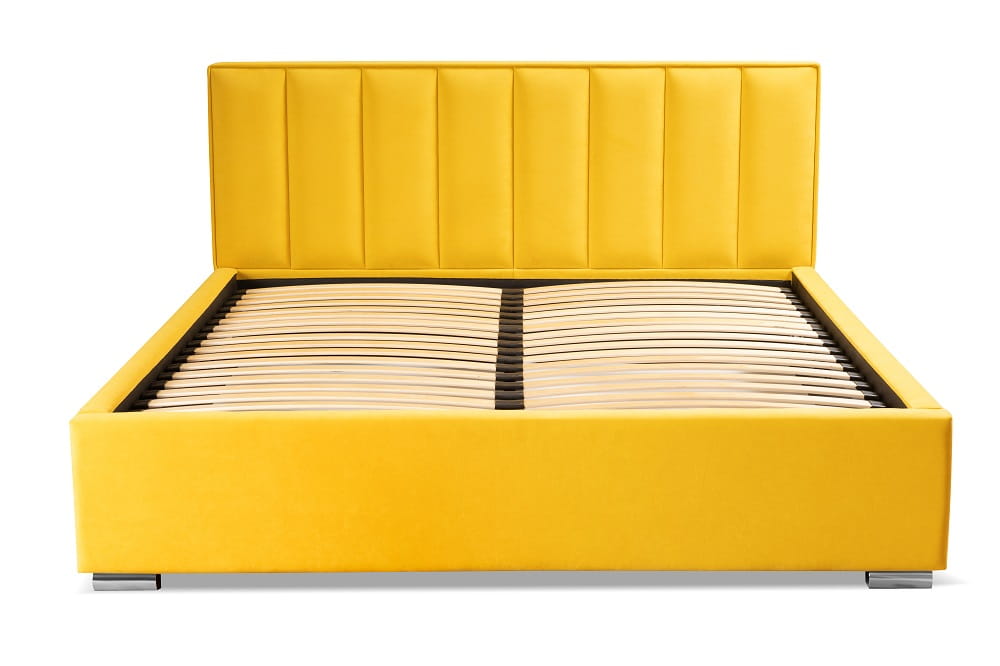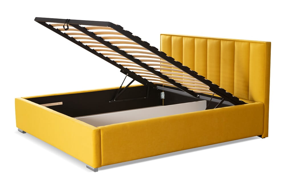 Łóżko tapicerowane PAULINO wyposażono w przeszyty zagłówek, duży, dzielony w połowie pojemnik na pościel, stelaż na metalowej ramie oraz gazowe podnośniki.