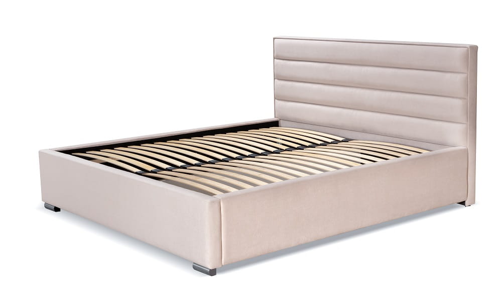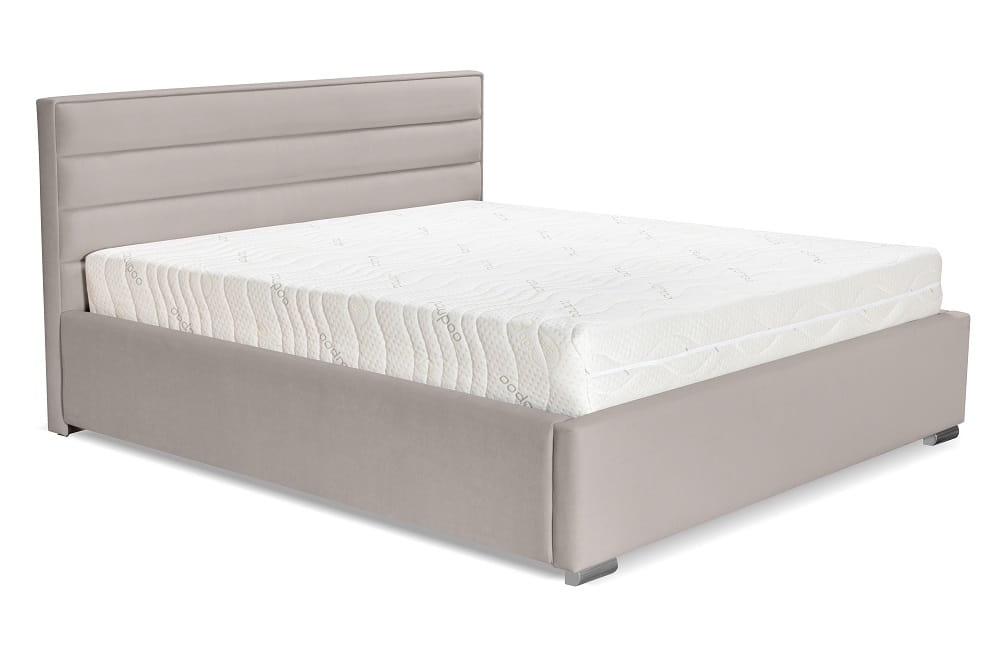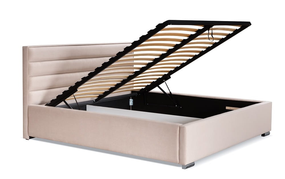 Łóżko tapicerowane SENO wyposażono w przeszyty zagłówek, duży, dzielony w połowie pojemnik na pościel, stelaż na metalowej ramie oraz gazowe podnośniki.