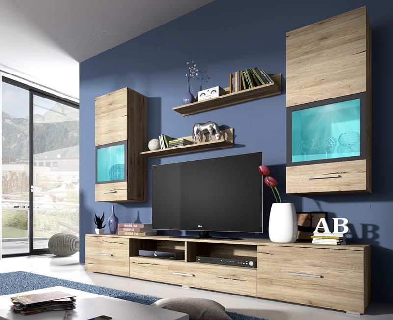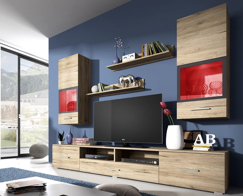 Meblościanka SARAH składa się z dwóch, bliźniaczych witryn wiszących, długiej szafki RTV oraz dwóch praktycznych półek. Zestaw dzięki dwóm wariantom kolorystycznym może zostać wykorzystany zarówno do nowoczesnych, jak i klasycznych aranżacji wnętrz. Wersja w białym połysku rozświetli pomieszczenie, a san remo jasne doda mu ciepła i przytulności. Warto zdecydować się również na opcjonalne oświetlenie LED wielokolorowe, dzięki któremu wnęki witryn przybiorą preferowany kolor i zależnie od okoliczności zupełnie odmienią wizerunek mebli.
