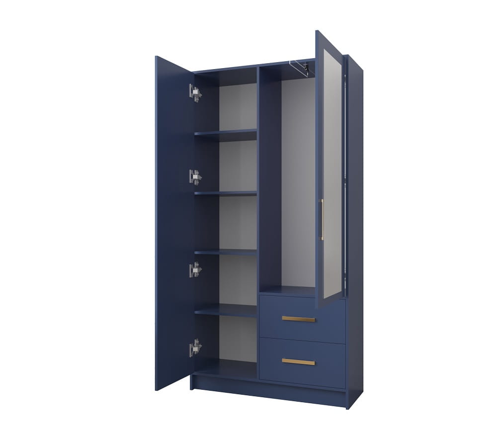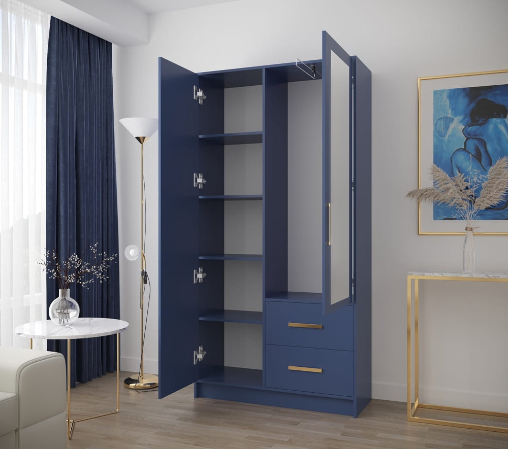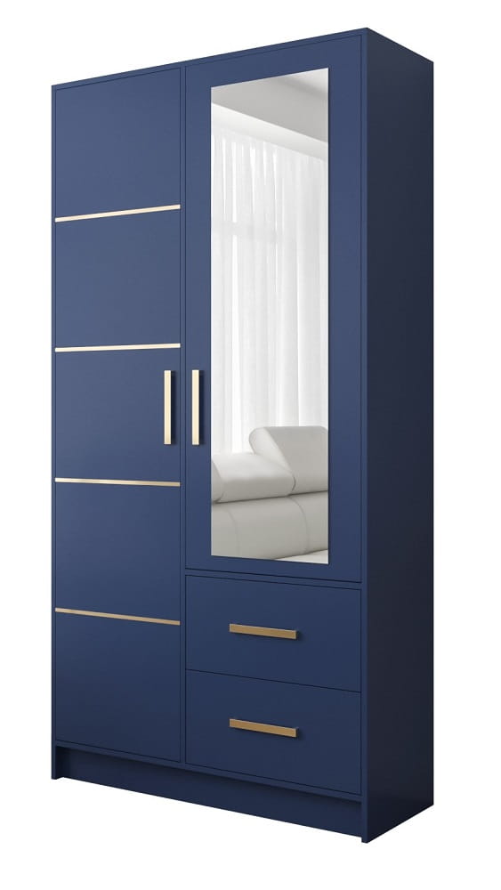 Szafa z lustrem BLITO to połączenie nowoczesności z oryginalnym wzornictwem. Dzięki swojej barwie oraz złotym dodatkom, tworzy wnętrze w stylu klasycznym, a zarazem mieszącym się w aktualnych trendach. Granatowe meble coraz częściej goszczą w naszych domach, odświeżając wnętrza i nadając im niezwykłego charakteru.
