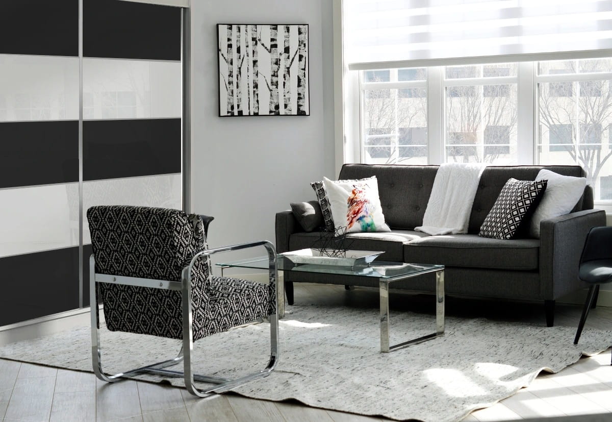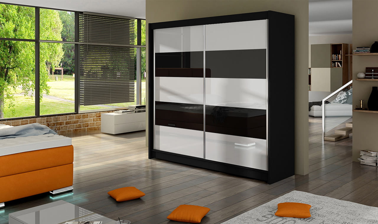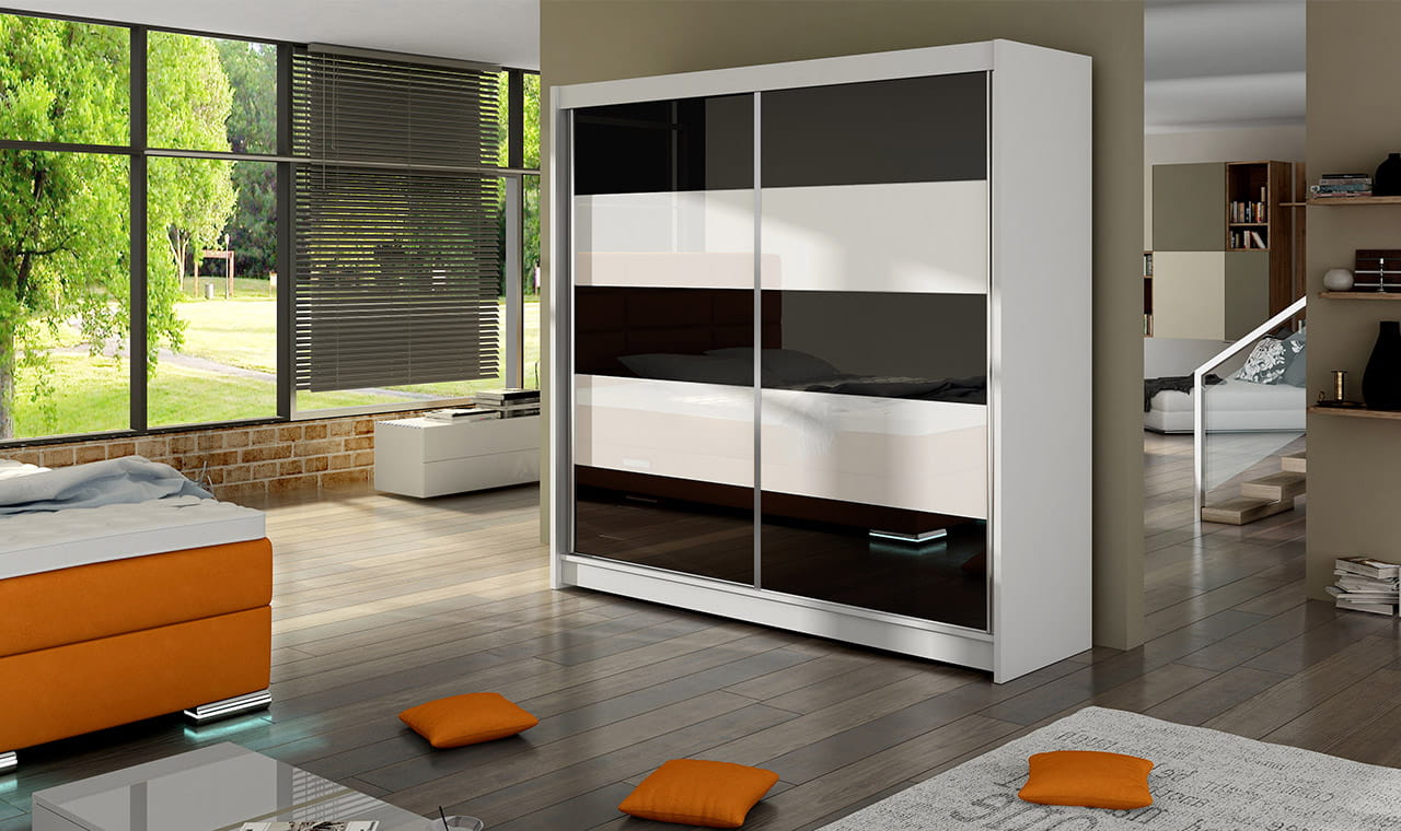 Trzeci model szafy od FALKO poleca się do wnętrz awangardowych wykończonych w stonowanych odcieniach. Ciekawe ułożenia ozdobnego szkła Lacobel opartego na grze przeciwstawnych odcieni zapewni aranżacji szczypty nowoczesnego wdzięku, którego pozazdroszczą Ci goście. Materiał ten obecnie cieszy się dużą popularnością, posiadacze szaf z tym wyposażeniem cenią je za efekt delikatnego odbicia światła. Masywna bryła chowa w swym wnętrzu półki oraz drążek umożliwiający komfortowe przechowywanie części garderoby bez obawy o problemy z zaprowadziłem porządku. Aluminiowe rączki zamontowane wzdłuż przesuwnych drzwi zagwarantują łatwe otwieranie i zamykanie szafy. Szafy FALKO to idealne rozwiązanie do pokoju dziennego, sypialni czy przedpokoju.