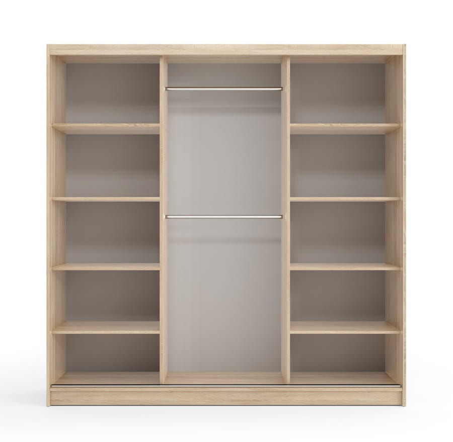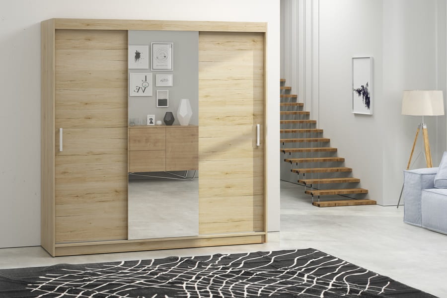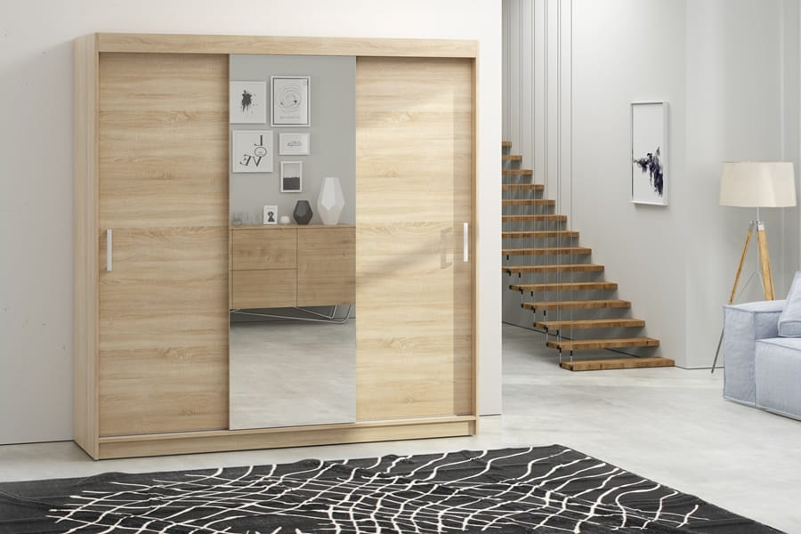 Urządzając salon, przedpokój bądź sypialnię warto pomyśleć o odpowiedniej organizacji przestrzeni. Bez wątpienia w takiej sytuacji doskonale odnajdzie się szafa TAMARA, dysponująca pokaźną powierzchnią przechowywania. Posiada troje drzwi przesuwnych, z których na jednym zostało naklejone duże lustro. Na pozostałych frontach, po bokach, widnieją uchwyty, ułatwiające otwieranie mebla. Środek obfituje w osiem pojemnych półek oraz dwa drążki na wieszaki z ubraniami. Szafa dostępna jest w czterech wybarwieniach - białym, dębie sonoma, dębie cantenbury i san remo.