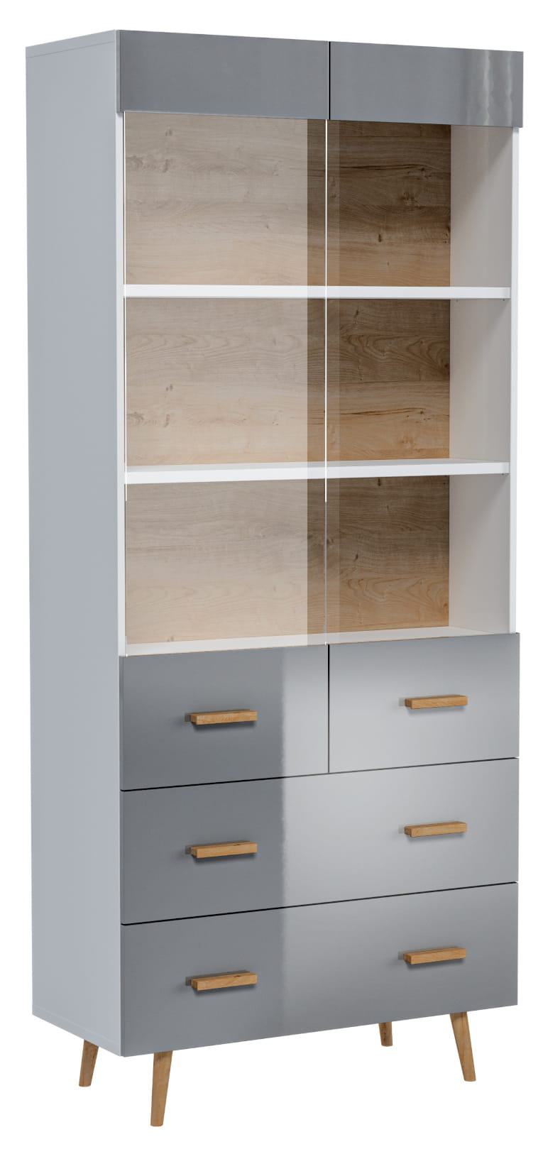 Witryna BRILLO to nowoczesne rozwiązanie dla wnętrz o skandynawskim wydźwięku. Dostępne opcje kolorystyczne frontów połączone ze świetlistą bielą nadadzą każdemu wnętrzu eleganckiego charakteru, okraszonego prostotą i minimalizmem. Funkcjonalny mebel został dodatkowo wzbogacony w kontrastowe uchwyty oraz drewniane nóżki, kreując jego oryginalność i stylowość. Urządzenie modnego, skandynawskiego pokoju lub salonu z kolekcją BRILLO będzie łatwe i przyjemne, a końcowy rezultat zaowocuje radością, satysfakcją oraz komfortem w przebywaniu w tak wyjątkowo zaaranżowanej przestrzeni.