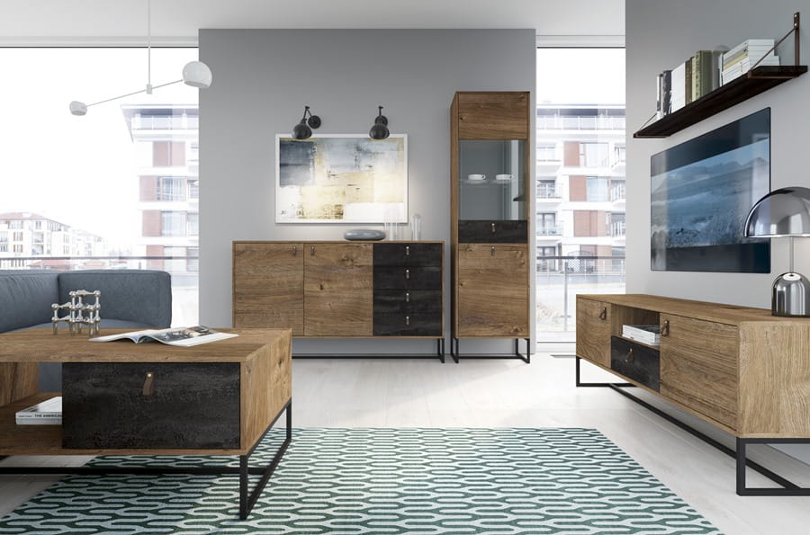Kolekcja DAKAR jest zaskakującym połączeniem industrialnej stylistyki z nutami rustykalnego designu. Płyta została wybarwiona na drewnopodobny, brązowy odcień, natomiast niektóre fronty tworzy płyta wzorująca się na barwie naturalnego, czarnego kamienia. Dzięki tak unikalnej kolorystyce i wzornictwie, zyskasz oryginalną kompozycję mebli do salonu. Dodatkową ozdobą brył okazują się skórzane uchwyty z mosiężnym mocowaniem, a także metalowe nogi, malowane metodą proszkową. Przyciągający spojrzenia i emanujący wyrazistym charakterem salon, to cel nadrzędny kolekcji DAKAR!