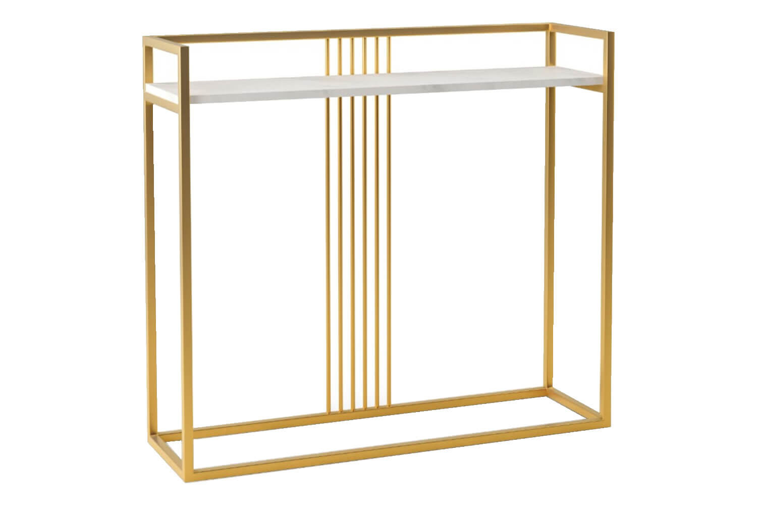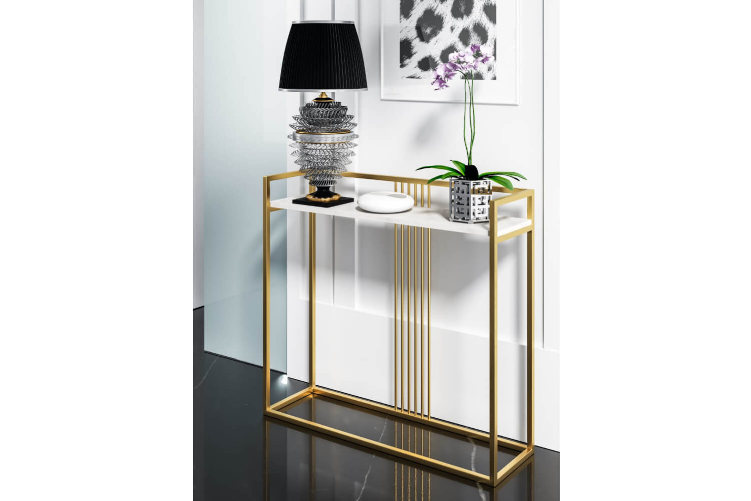 Podstawa wykonana została z solidnej stali malowanej proszkowo w kolorze złotym, co nada blasku i oryginalnego charakteru w każdym pomieszczeniu. Blat wykonany z wysokiej jakości płyty laminowanej o grubości 18 mm dopełni aranżację wieloma wybarwieniami. Mebel odporny jest na zadrapania, zarysowania, uderzenia oraz wysokie temperatury. Konsola dostarczana jest w całości co czyni ją niezwykle solidną i stabilną.