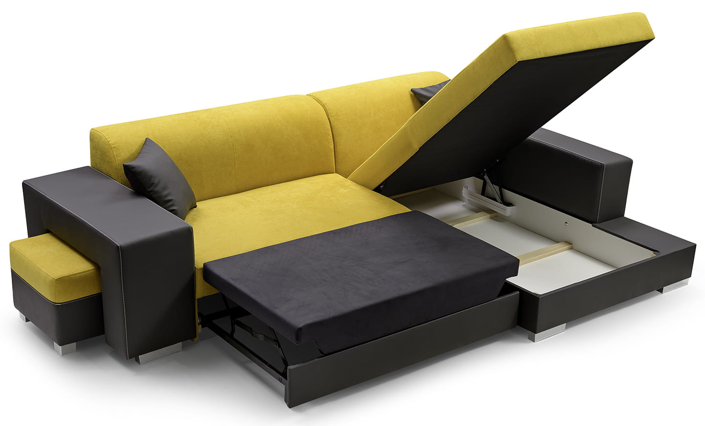 Wygodny i funkcjonalny narożnik do salonu Madagaskar został wyposażony w praktyczną funkcję spania oraz pojemnik na pościel. Dodatkowo w zestawie dostaną Państwo pufę, która tworzy spójną całość z wyżej wymienionym narożnikiem oraz daje nam dodatkową powierzchnię do usadzenia gości lub nie zabiera miejsca gdy nie jest potrzebna. Narożnik dostępny jest w wielu tkaninach do wyboru.