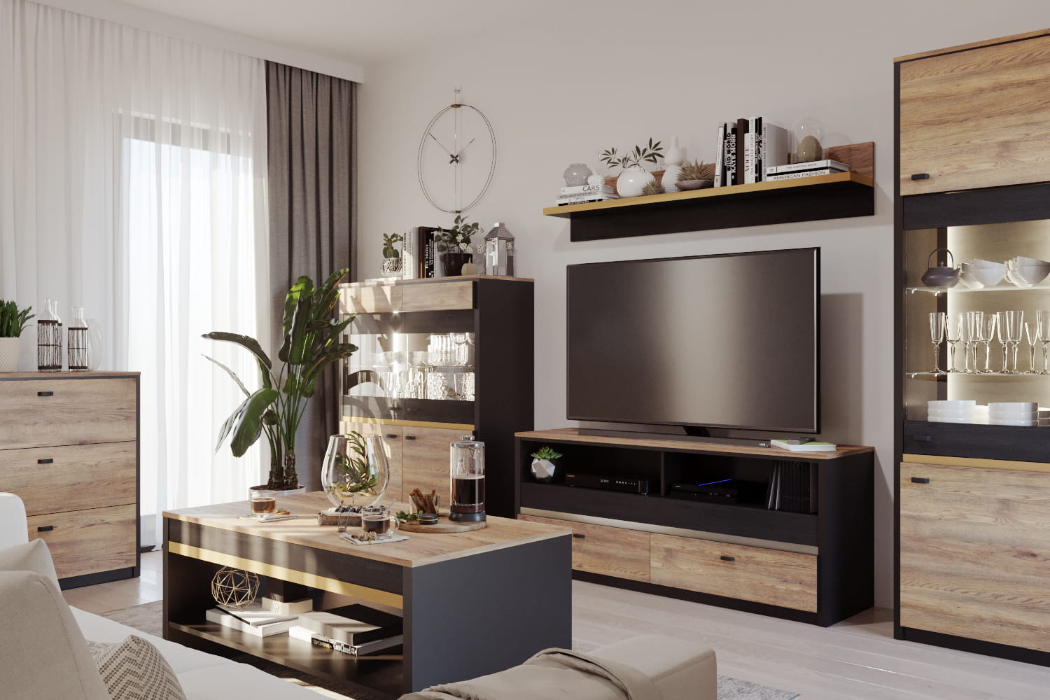 Meble BELIZE to eleganckie rozwiązanie do nowoczesnych wnętrz salonu czy jadalni. Proste bryły mebli, na które składają się czarne korpusy oraz fronty w kolorze dąb wersal bez wątpienia ocieplą nowoczesne pomieszczenie, a listwy w kolorze szczotkowanego złota nadadzą Państwa wnętrzu niepowtarzalnego designu w stylu glamour. Dodatkowe opcjonalne oświetlenie LED witryn podkreśli rysunek drewna na plecach mebli oraz pozwoli oryginalnie wyeksponować ulubioną porcelanę umieszczoną za szkłem. Delikatne czarne uchwyty podkreślają unikalną stylistykę mebli, a zarazem idealnie dopełniają całość formy.