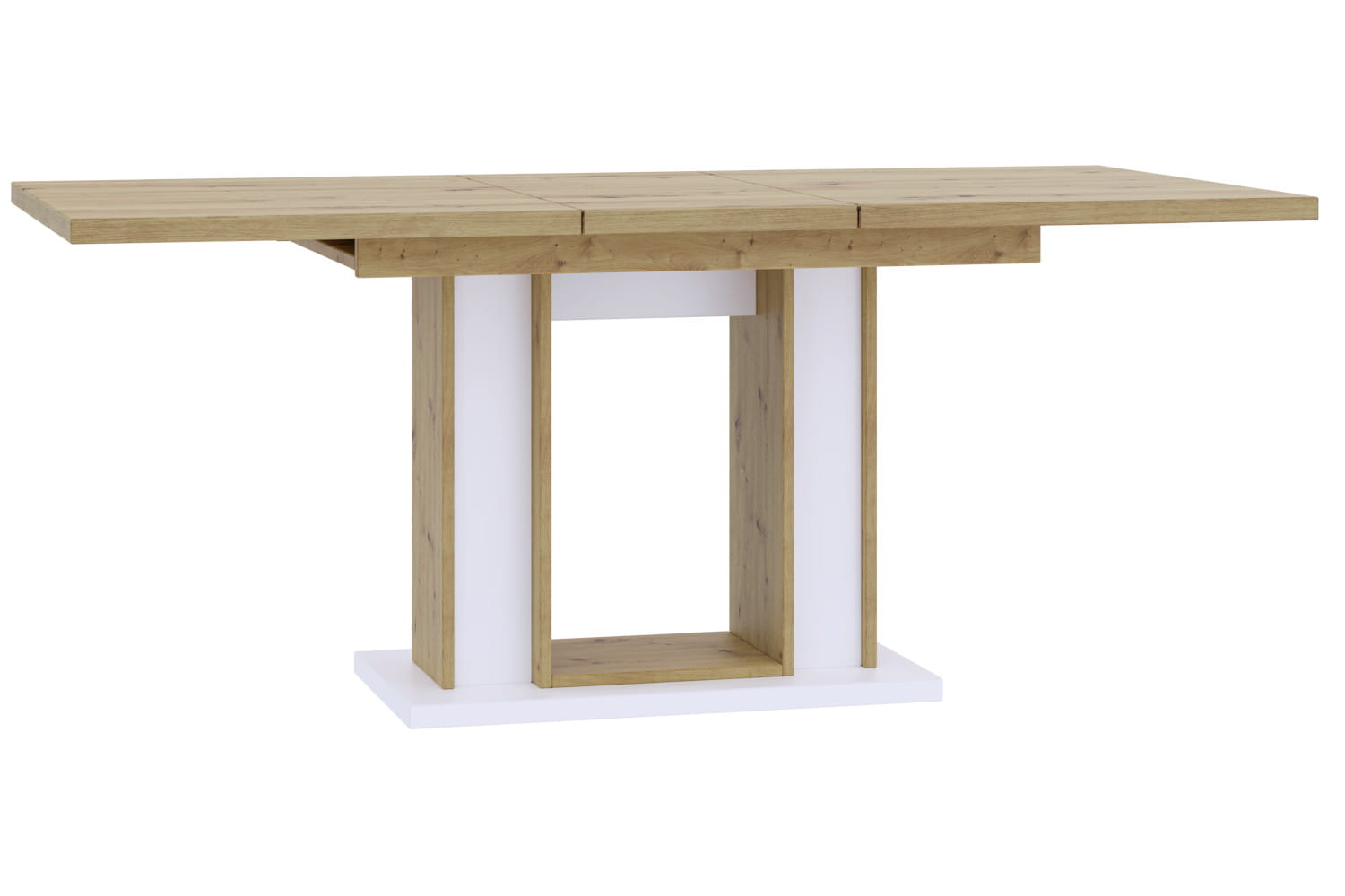 Blat oraz podstawę wykonano z pogrubionej, laminowanej płyty 36 mm, w trosce o najwyższą jakość oraz podwyższony komfort użytkowania. Stół pod blatem posiada miejsce na przechowywanie wkładki. Po rozłożeniu osiąga 180 cm szerokości.