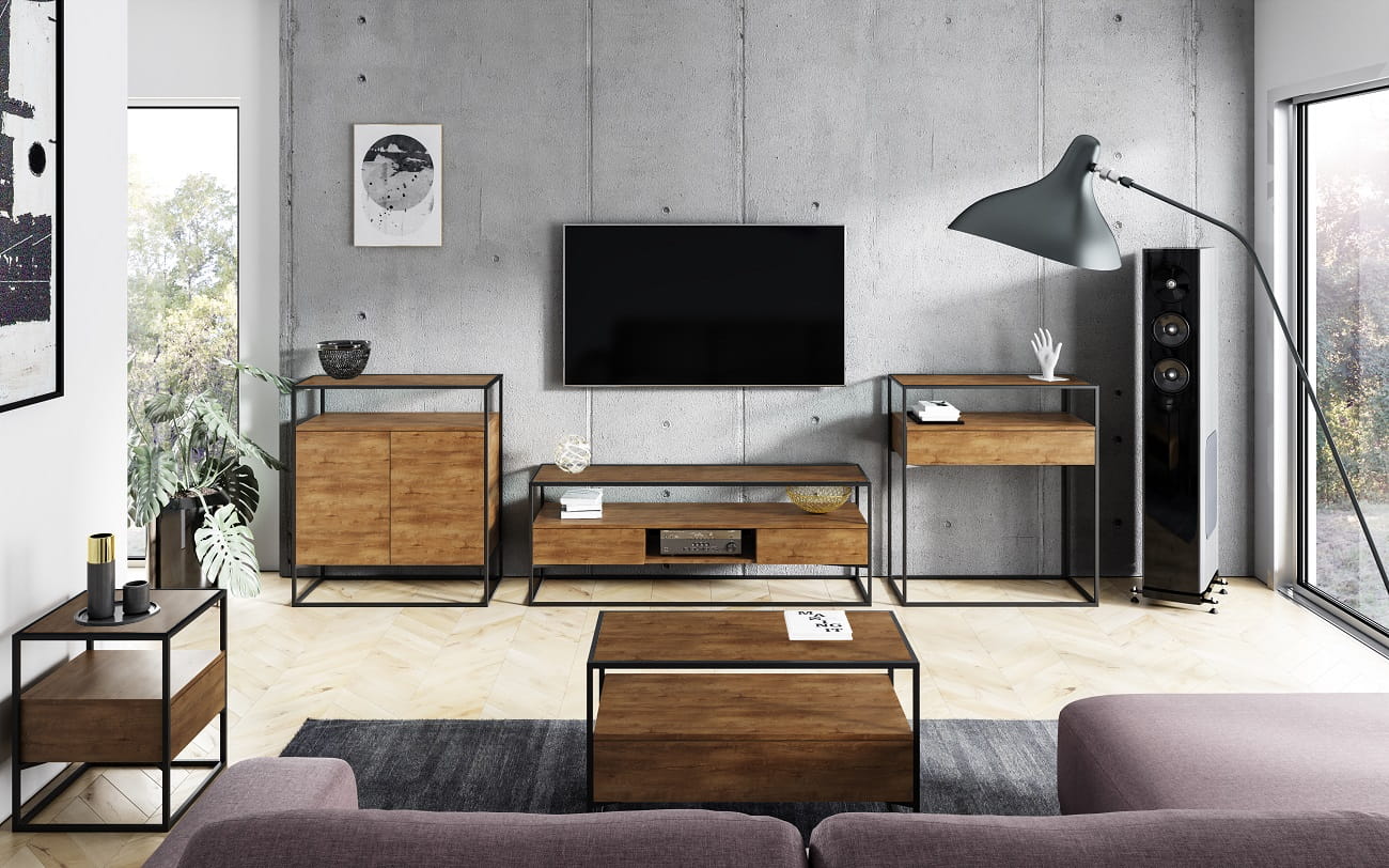 Kolekcja w stylu loftowym BOX do pokoju dziennego to nowoczesna propozycja do odważnych wnętrz w prostym industrialnym stylu. Połączenie stalowej konstrukcji i płyty w kolorze zbliżonym do naturalnego drewna sprawia, że meble idealnie sprawdzą się w każdym rodzaju wnętrza. Wąskie profile stelaża dodają meblom lekkości i charakteru. Pomimo delikatnego wyglądu cała kolekcja jest bardzo stabilna i wytrzymała. Płyta laminowana jest bardzo odporna na zarysowania, co jest szczególnie ważne przy meblach użytkowanych każdego dnia. Do wyboru mamy trzech warianty kolorystyczne dąb lefkas ciemny, dąb craft złoty, dąb lancelot dodatkowo wybieramy wariant blatu wykonanego z płyty laminowanej lub ze szkła. Cała kolekcja została stworzona z myślą o osobach, które kochają meble funkcjonalne i designerskie.