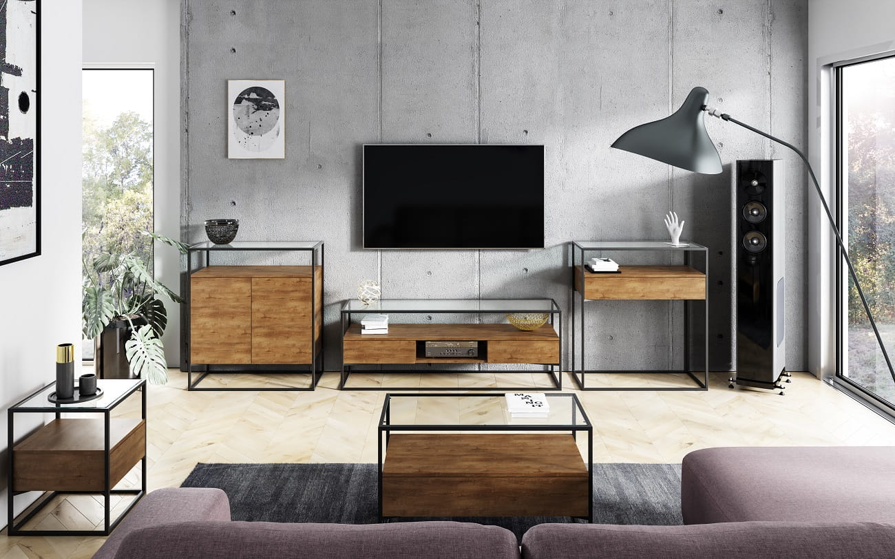 Kolekcja w stylu loftowym BOX do pokoju dziennego to nowoczesna propozycja do odważnych wnętrz w prostym industrialnym stylu. Połączenie stalowej konstrukcji i płyty w kolorze zbliżonym do naturalnego drewna sprawia, że meble idealnie sprawdzą się w każdym rodzaju wnętrza. Wąskie profile stelaża dodają meblom lekkości i charakteru. Pomimo delikatnego wyglądu cała kolekcja jest bardzo stabilna i wytrzymała. Płyta laminowana jest bardzo odporna na zarysowania, co jest szczególnie ważne przy meblach użytkowanych każdego dnia. Do wyboru mamy warianty kolorystyczne dąb lefkas ciemny, dąb craft złoty, dąb lancelot dodatkowo wybieramy wariant blatu wykonanego z płyty laminowanej lub ze szkła. Cała kolekcja została stworzona z myślą o osobach, które kochają meble funkcjonalne i designerskie.