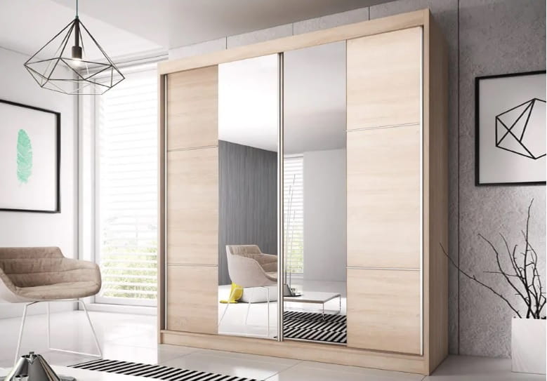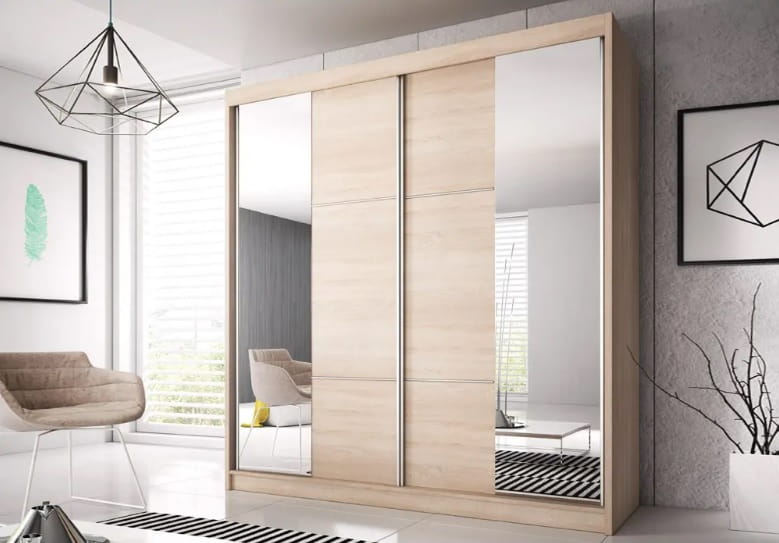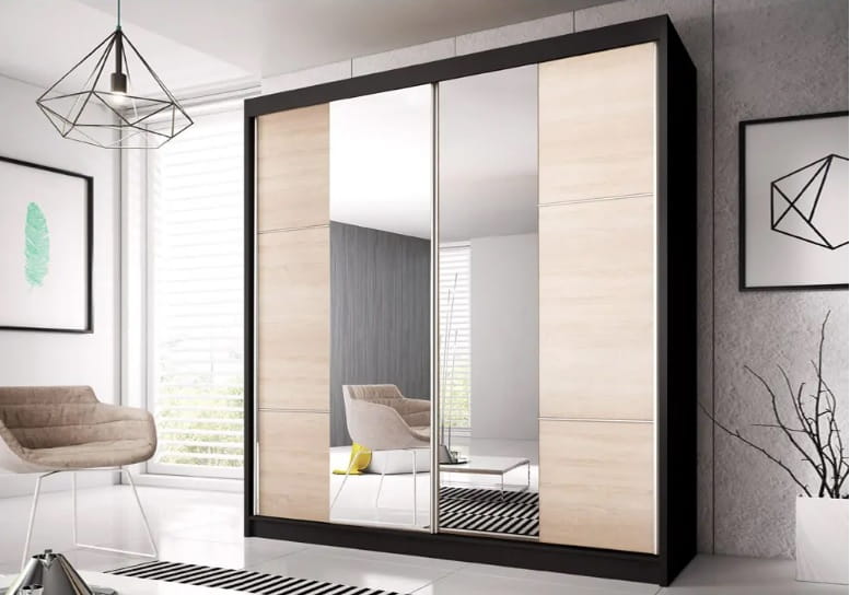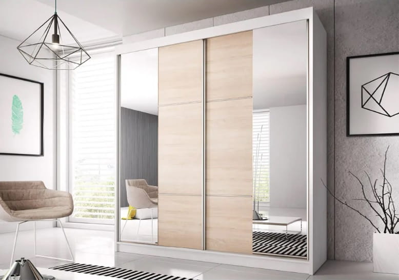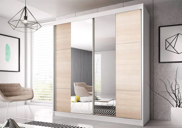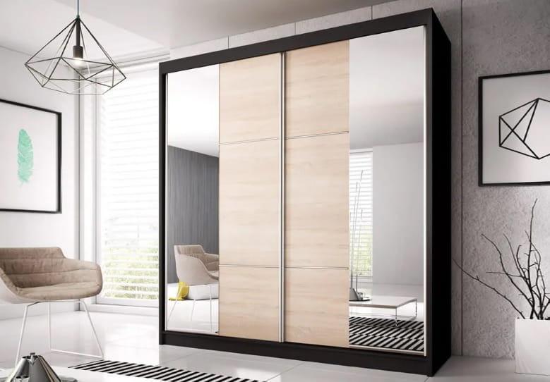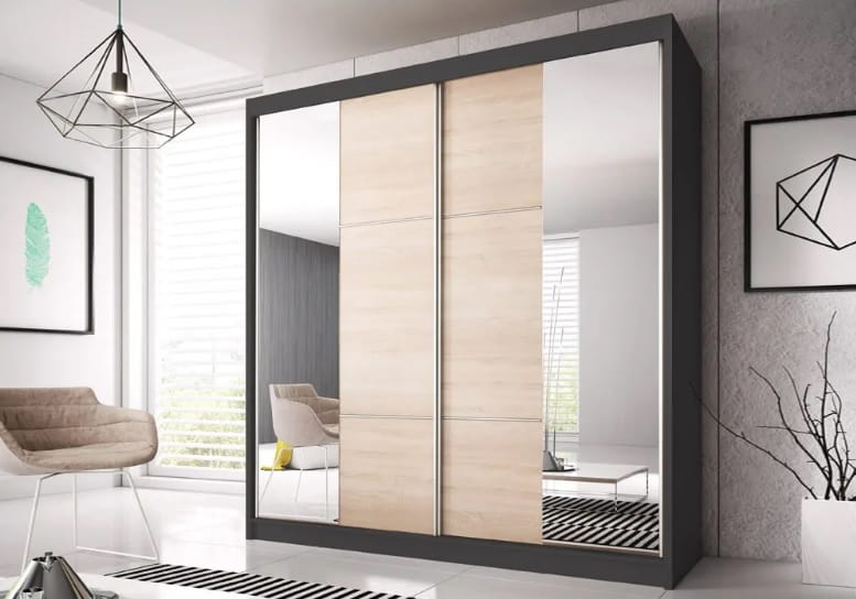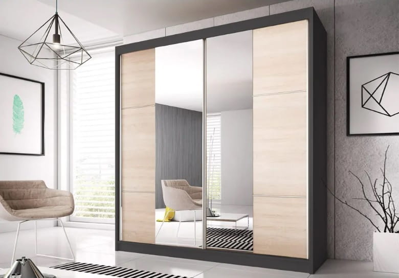 ULTI 36 jest meblem o unikalnym i współczesnym wyglądzie. Doskonale odnajdzie się we wnętrzu klasycznego bądź nowoczesnego salonu, przedpokoju czy sypialni. Dostępna jest w kilku wariantach kolorystyczne biały, czarny, dąb sonoma czy grafit. Fronty szafy wykonane w połowie z płyty w kolorze dąb sonoma, w połowie z lustra nadają unikalnego stylu. Obszerne wnętrze dzielone na cztery pionowe przestrzenie oraz górny pawlacz pozwoli pomieścić wszelką odzież, nawet całej rodziny. Dwa drążki pozwolą powiesić dłuższe ubrania pozwalając zaoszczędzić czas na prasowaniu, dzięki półkom zorganizujesz także pozostałą przestrzeń.Wytrzymały system drzwi przesuwnych zagwarantuje płynne otwieranie.