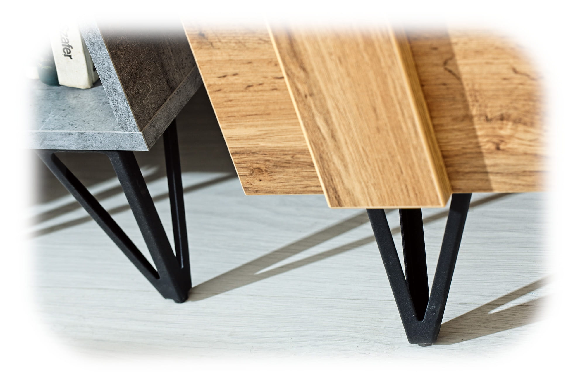 Metalowe geometryczne nóżki w kształcie trójkątów nadają meblom lekkości, uchwyty zastosowane przy drzwiach i szufladach przyciągają wzrok, a dodatkowe okucia przy listwach dekoracyjnych na frontach i zwieńczeniach mebli łączą detale w jedną całość i nadają meblom specyficznego charakteru.