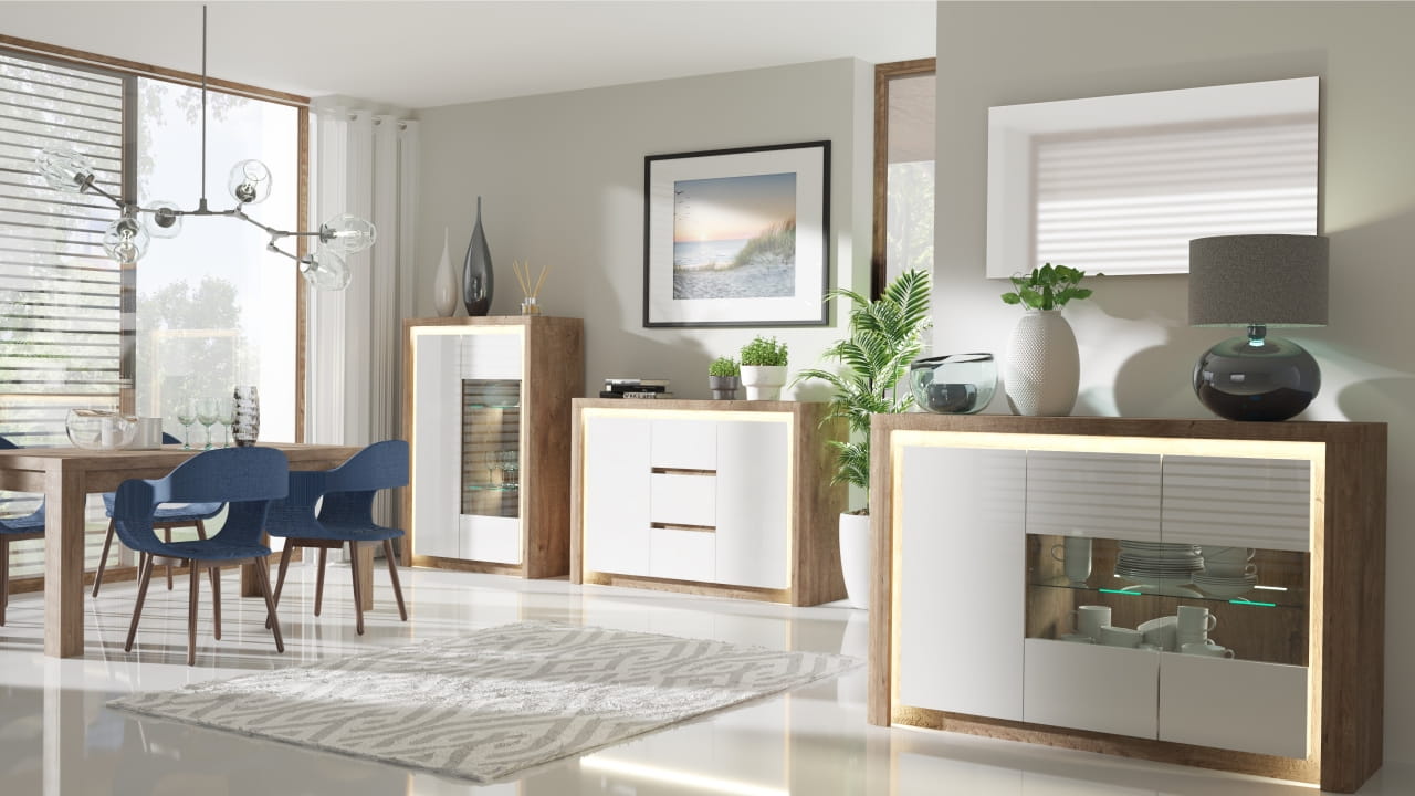 Wyjątkowy zestaw mebli Liwio został stworzony z wysokiej jakości płyt w ciepłym, naturalnym kolorze ribbeck w połączeniu z bielą. Fronty na wysoki połysk optycznie powiększą przestrzeń i wizualnie rozświetlą pomieszczenie. System cechują proste kształty oraz nowoczesna stylistka. Dobrze przemyślane wnętrze jest praktyczne w użytkowaniu i sprzyja przyjemnemu spędzaniu czasu.