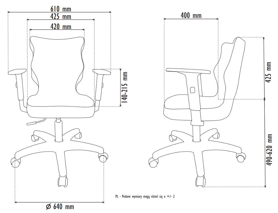 Szczegółowe wymiary krzesła (rozmiar 5 - wzrost: 146 - 176,5cm):