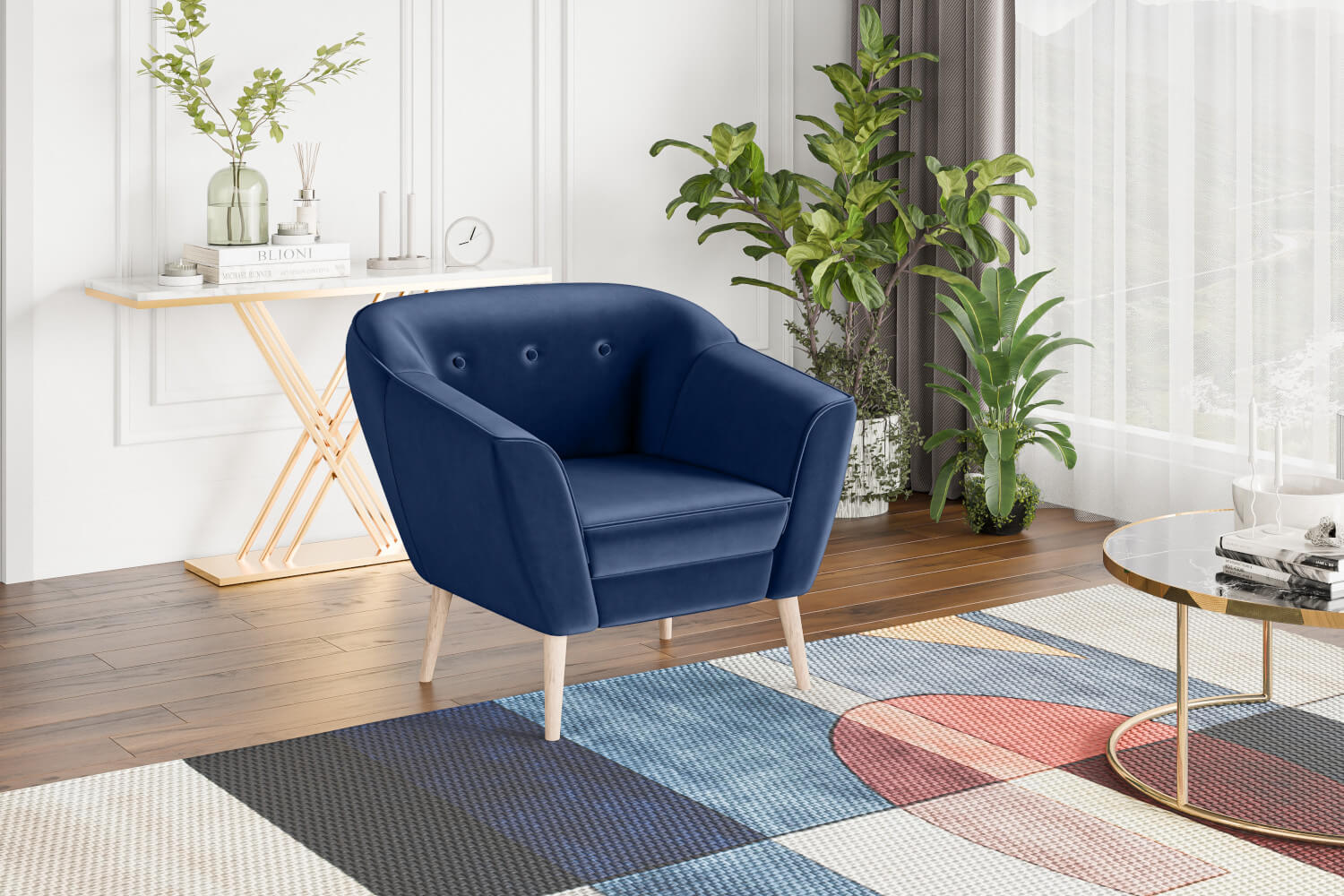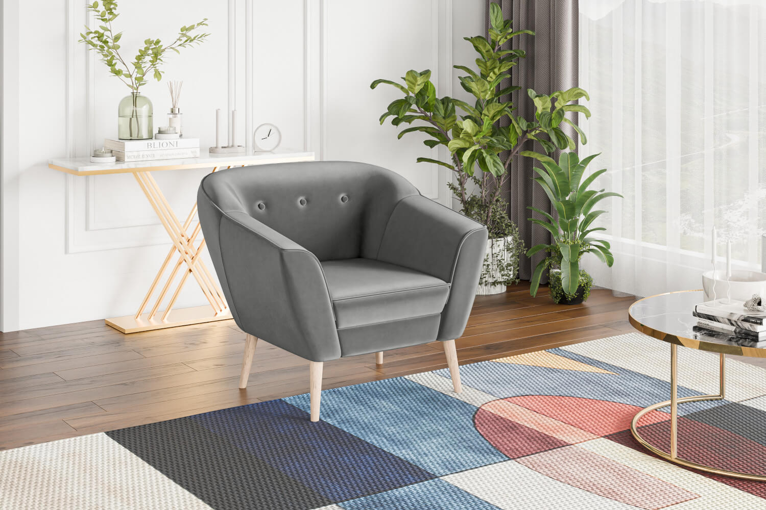 Fotel do salonu w stylu skandynawskim DIMA I drewniane nóżki