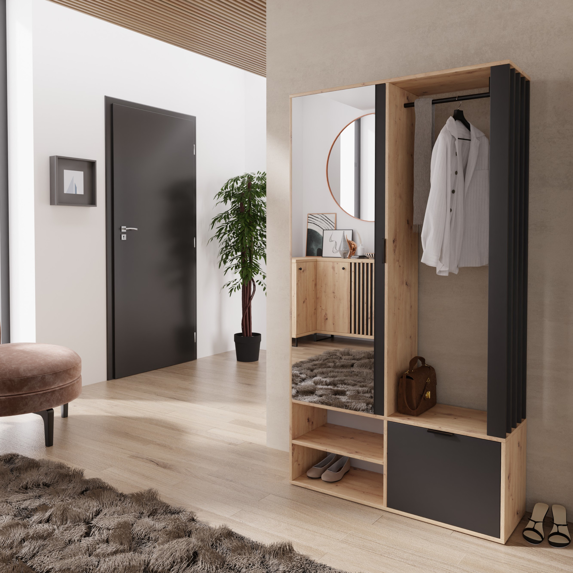 Garderoba do przedpokoju to wciąż jeden z najczęściej spotykanych elementów wyposażenia mieszkania oraz domu. Pod jej nazwą kryje się szafa służąca do przechowywania butów oraz ubrań wierzchnich. Propozycja o nazwie MILO w pełni wykorzystuje możliwości, jakie przypisujemy meblom znajdującym się w przedsionku. Postawienie na niezawodną płytę laminowaną zagwarantuje długi czasu użytkowania, bez obawy o uszkodzenia spowodowane urazami mechanicznymi oraz oddziaływaniem szkodliwych czynników zewnętrznych. Model ten oferuje funkcjonalne rozwiązania w formie metalowego drążka oraz lustra, skrywającego przemyślany układ półek. Dolna szafka wraz z otwartą wnęką pozwolą na składania obuwia sezonowego. Znakiem rozpoznawczym MILO są lamele, które zamontujesz po prawej lub lewej stronie. Garderoba występuje w dwóch opcjach kolorystycznych: cała w dębowym odcieniu artisan lub z domieszką czarnej płyty.