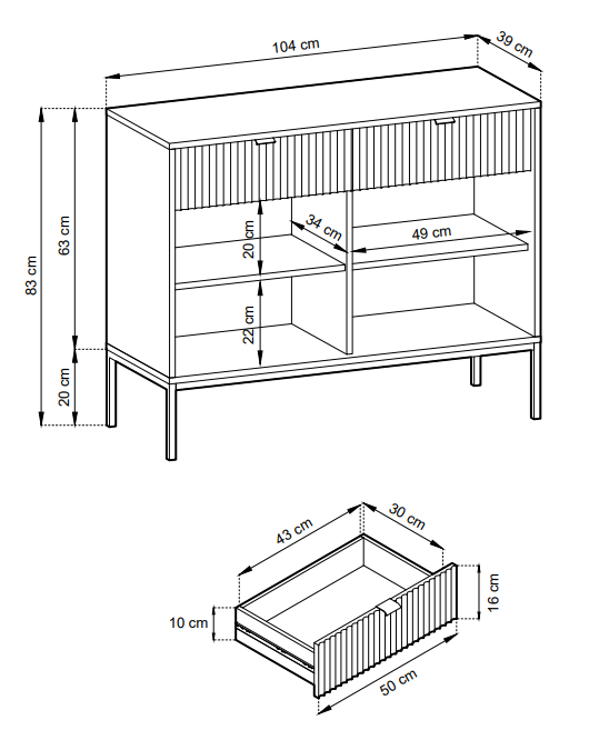Komoda z kolekcji Novi sprawdzi się jako element salonu, przedpokoju czy sypialni. Posiada dwie pojemne szuflady oraz przestrzeń z półkami zamykaną drzwiami uchylnymi.