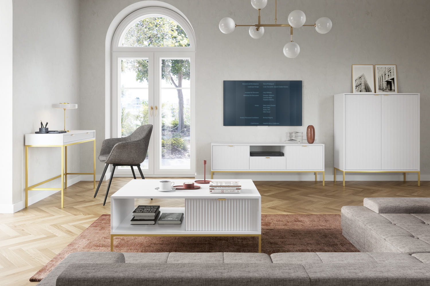 Kolekcja Novi reprezentuje połączenie funkcjonalności i estetyki, które sprawiają, że każde wnętrze staje się wyjątkowe. Jej charakterystyczne ryflowane fronty wykonane z solidnej płyty MDF o grubości 18 mm oraz eleganckie, malowane proszkowo nóżki ze stali nadają meblom nowoczesny i wyrafinowany wygląd. Dostępność czterech uniwersalnych kolorów - klasycznego czarnego, subtelnie szarego, czystego białego oraz eleganckiego labrador green, pozwala dopasować meble do różnorodnych aranżacji wnętrz, dodając im charakteru i indywidualnego stylu. Opcja wyboru koloru stelaża - czarnego lub złotego - daje klientom możliwość personalizacji mebli, co sprawia, że są one jeszcze bardziej dostosowane do ich preferencji i potrzeb. Kolekcja Novi obejmuje różnorodne elementy, takie jak komody, szafki RTV, ławy kawowe czy toaletki, które doskonale sprawdzą się zarówno w salonie, jak i strefie przedpokojowej. Dodatkowo, meble te wyposażone są w subtelne uchwyty malowane proszkowo w ekskluzywnym złotym kolorze, nadającym im elegancji i wyjątkowego charakteru.