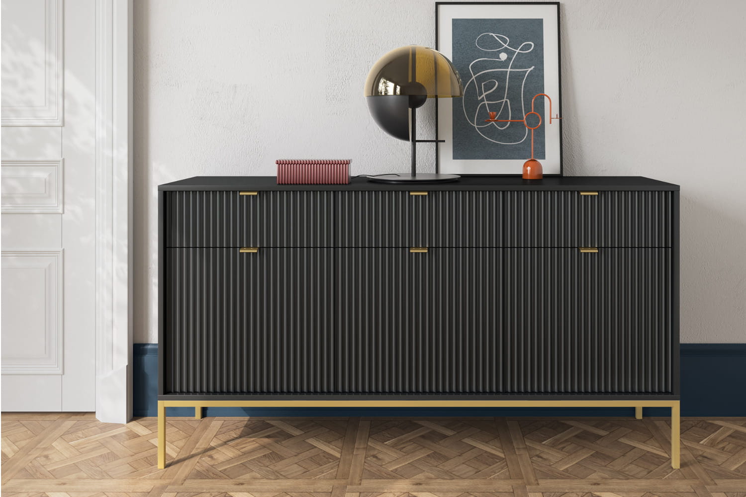 Komoda szeroka Novi dzięki trzem szufladom i trzem szafkom zamykanym pomieści wszelkie dokumenty czy zastawy stołowe. Może także służyć jako barek na alkohol czy słodycze dla najmłodszych.