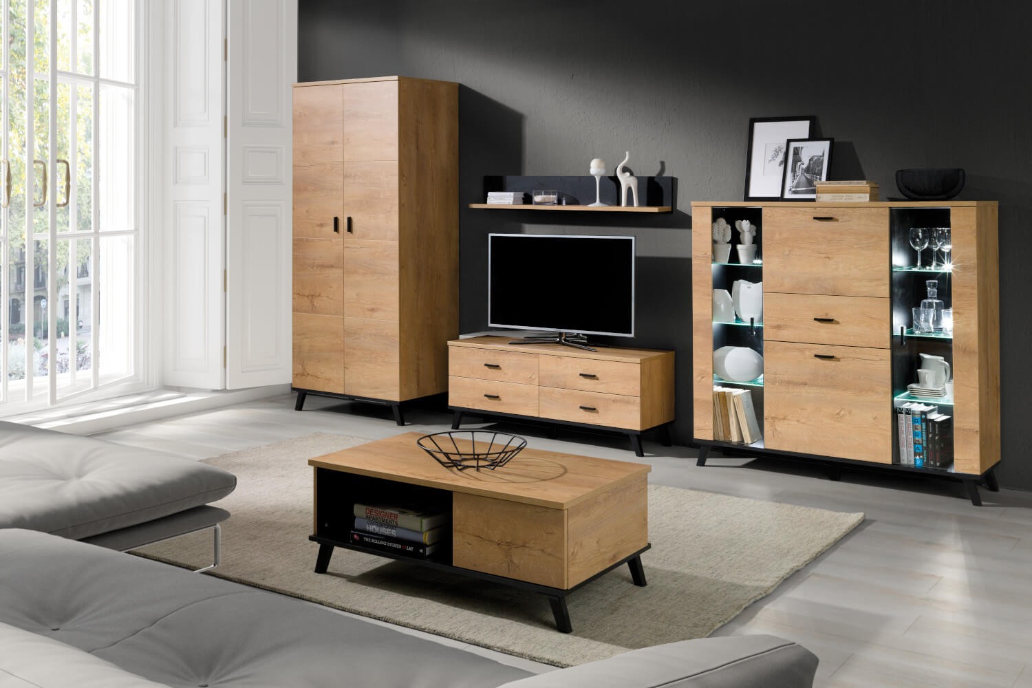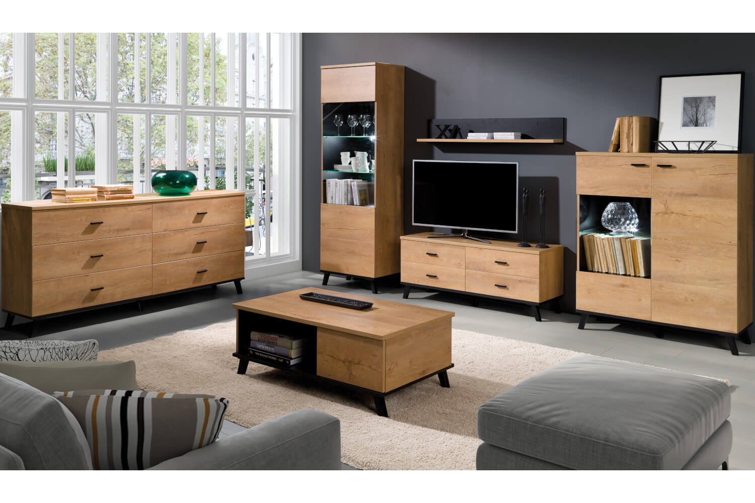 Komoda JON należy do kolekcji wykreowanej z myślą o nowoczesnym wzornictwie. Składa się z elementów wybawionych na kolor naturalnego drewna, doprawionego czarnymi detalami w postaci uchwytów i nóżek, na których zostały osadzone masywne bryły. Reprezentacyjny wygląd systemu będzie świetnym pomysłem na urządzenie pokoju dziennego, będącego głównym miejscem wszelkiego typu spotkań towarzyskich bądź wypoczynku. Nowoczesny i stylowy salon z systemem JON jest na wyciągnięcie ręki!