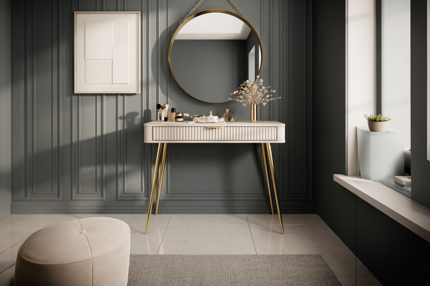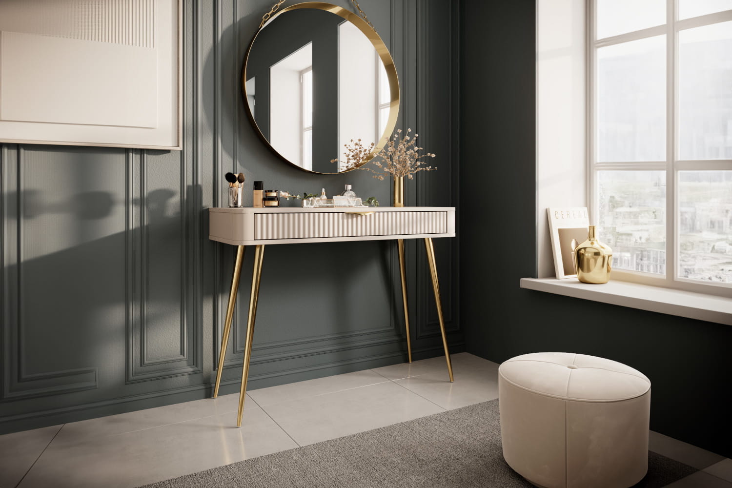 Toaletka Adelante to połączenie nowoczesnego designu z wyrafinowaną elegancją, które doda wnętrzu wyjątkowego charakteru. Jej beżowy laminowany blat harmonijnie współgra z ryflowanym frontem szuflady – detalem, który przyciąga uwagę i podkreśla jej wyjątkowość. Złote, smukłe nogi wprowadzają nutę luksusu, a obły uchwyt subtelnie uzupełnia całość, nadając jej lekkości. Adelante to nie tylko praktyczny mebel, ale również prawdziwa ozdoba wnętrza, która doskonale odnajdzie się w sypialni jako toaletka, lub w przedpokoju i salonie jako stylowa konsolka, dodając elegancji i funkcjonalności.