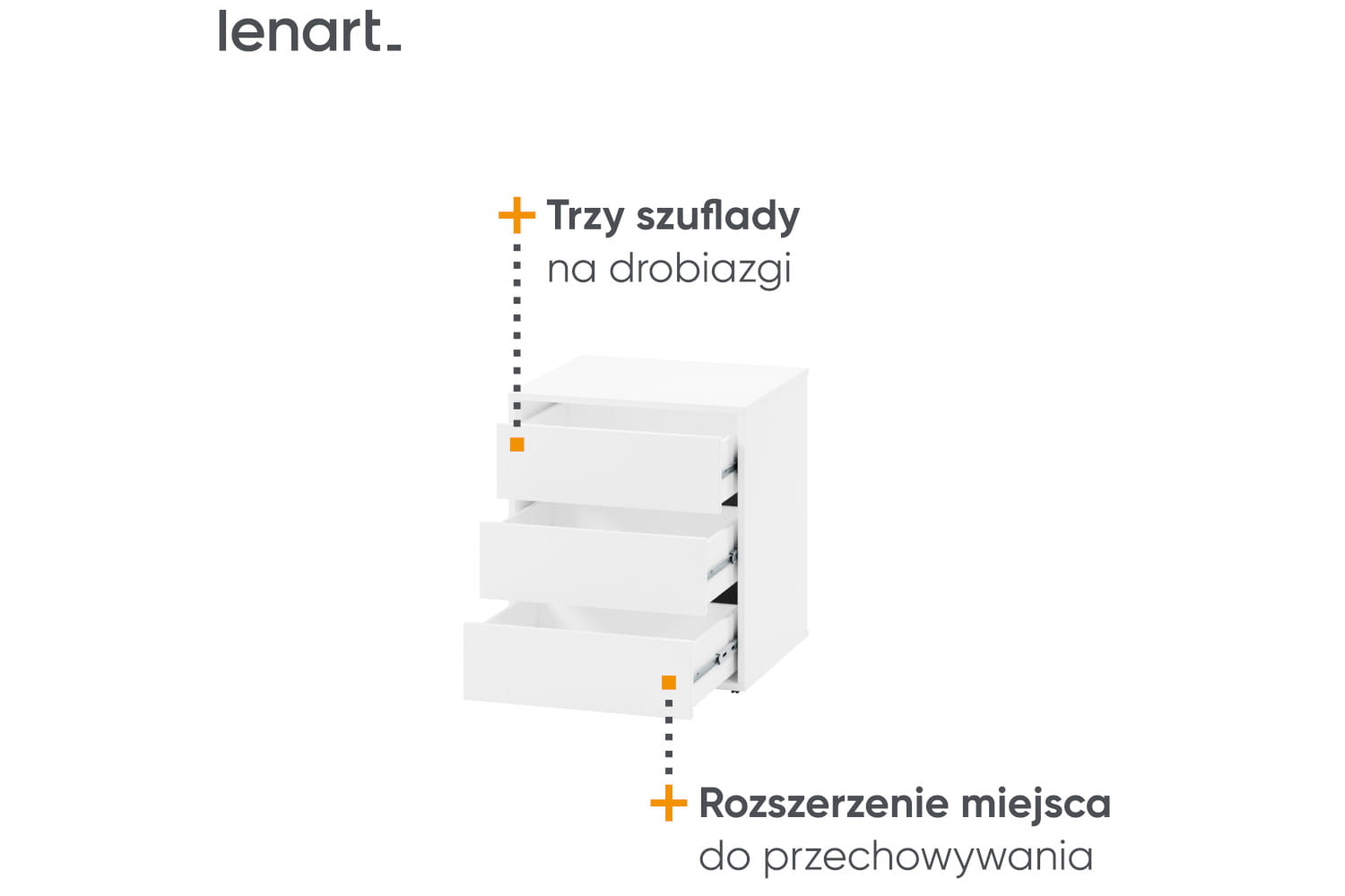 Dodatkowy element wyposażenia szafy, jakim jest kontenerek, to praktyczne oraz nowoczesne rozwiązanie, które cieszy się wciąż rosnącym zainteresowaniem naszych klientów. Model MX-07 został wykonany z białej płyty laminowanej. Front i blat posiadają standardową grubość 16 mm, podczas gdy korpus został wzmocniony pogrubioną płytą o wymiarze 22 mm. Trzy wysuwane szuflady pozwalają na posegregowanie drobnych elementów garderoby, takich jak skarpetki czy bielizna. Mebel ten można umieścić zarówno w szafie, jak i wykorzystać jako stolik nocny. Dzięki swym funkcjonalnościom i uniwersalnemu designowi, kontenerek MX-07 stanowi doskonałe uzupełnienie każdej przestrzeni sypialnianej, zapewniając zarówno porządek, jak i estetyczny wygląd.