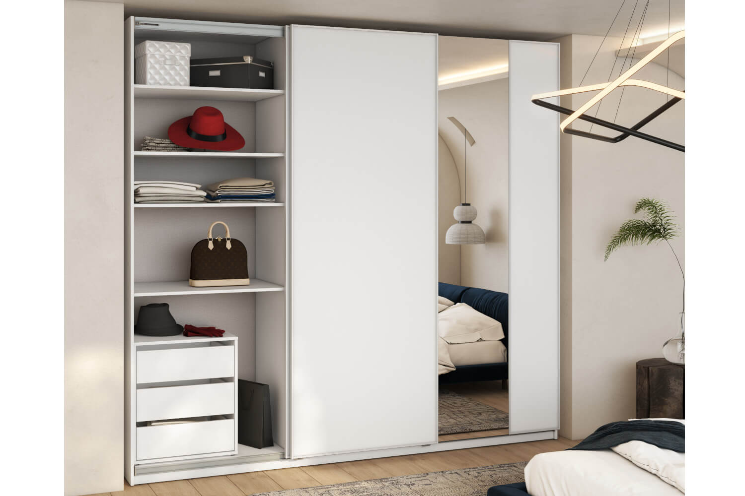 Kolekcja szaf MAXI to rozwiązanie dla osób poszukujących eleganckiego i funkcjonalnego mebla do przechowywania. Postawienie na technologię drzwi przesuwnych pozwoli na zaoszczędzenie miejsca. Lustro zdobiące front optycznie powiększy pomieszczenie delikatnie je rozjaśniając. Biały kolor pasuje do różnorodnych aranżacji. Starannie zaprojektowane wnętrze oferuje bogate wyposażenie. Elementy te pozwolą na zaprowadzenie porządku w garderobie. Standardowa oferta obejmuje 6 modeli szaf, dostosowanych do różnych potrzeb. Kolekcja szaf MAXI wyróżnia się dbałością o detale, wysoką jakością wykonania i możliwością personalizacji, tworząc stylowy element wystroju wnętrza.