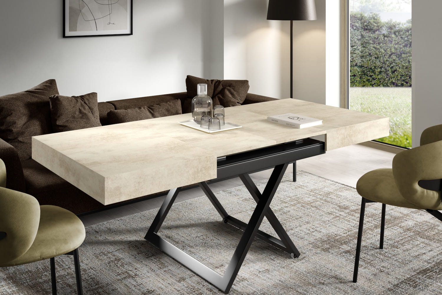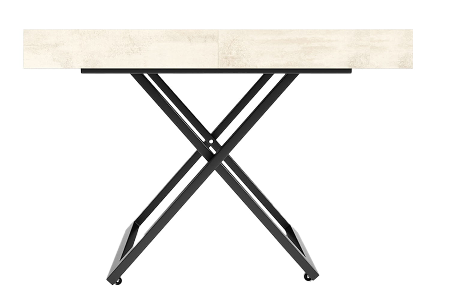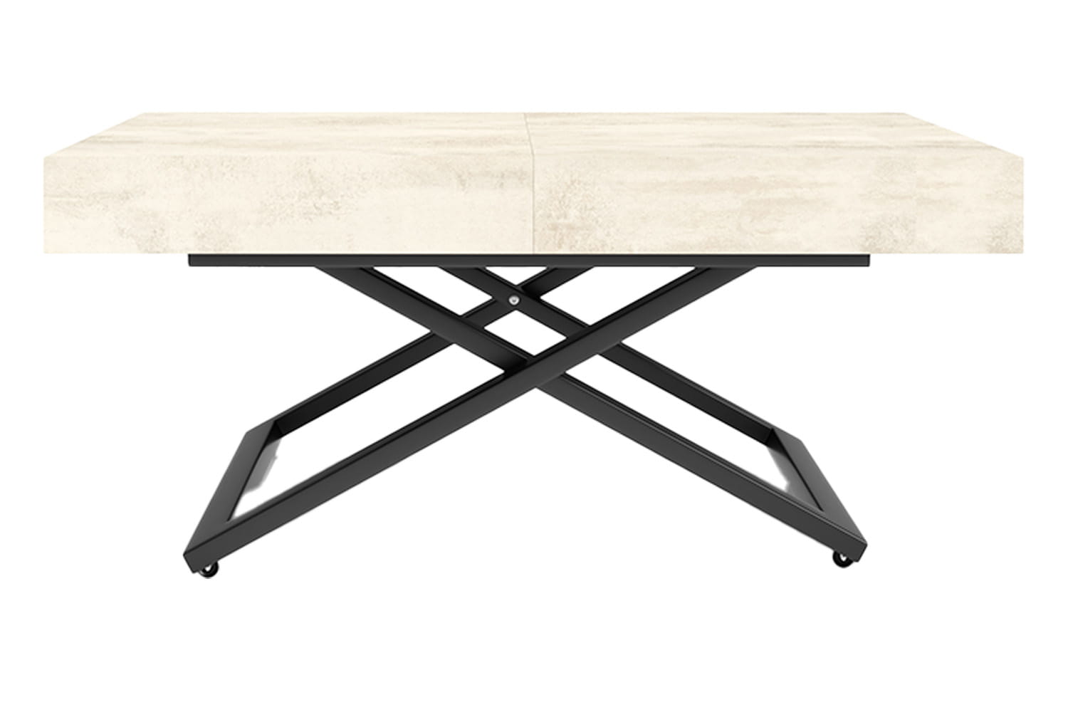 Dostępny w sześciu kolorach blat można łatwo dopasować do każdej aranżacji wnętrza. Nóżki, skrzyżowane w nowoczesny sposób, są nie tylko estetyczne, ale i praktyczne, a dzięki kółeczkom ławostół można wygodnie przemieszczać.