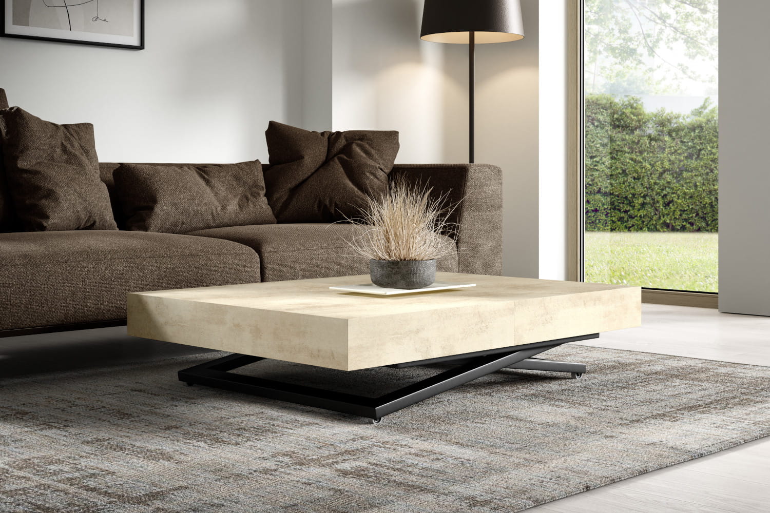 Ławostół SANA U to wszechstronny mebel, który łączy nowoczesny design z funkcjonalnością. Idealnie nadaje się do różnych typów wnętrz, oferując elastyczne użytkowanie zarówno jako ława kawowa, jak i stół jadalniany. Dzięki innowacyjnemu mechanizmowi podnoszenia, wysokość blatu można regulować od 27 cm do 76 cm, a mechanizm pozwala na zatrzymanie blatu na dowolnej wysokości w tym zakresie.