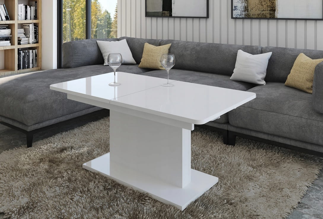 Ława rozkładana z funkcją stołu OPTI to idealne rozwiązanie do mieszkania, które nie posiada osobnej jadalni czy miejsca na ustawienie tradycyjnego stołu obiadowego. Wykonana z wysokiej jakości płyty wiórowej laminowanej o grubości 22 mm jest odporna na uszkodzenia mechaniczne, dodatkowo obrzeże zostało oklejone materiałem ABS. Swobodne rozsuwanie ławy do wielkości 168 cm jest wspomagane synchroniczną prowadnicą dzięki czemu jedna osoba jest w stanie samodzielnie wykonać tę czynność. Przekształcenie ławy w stół jest także bardzo proste dzięki gazowym podnośnikom pozwalającym na rozłożenie mebla bez użycia siły.