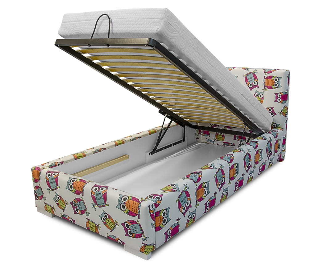 Łóżko KINDER zaprojektowane specjalnie z myślą o najmłodszych użytkownikach, zostało wykonane z najwyższej jakości materiałów. Jest to produkt trwały i solidny oraz łatwy w montażu. Łóżko wyposażone zostało w pojemnik na pościel, stelaż wykonany na ramie metalowej oraz podnośniki gazowe które ułatwiają podnoszenie. Kolorowa tapicerka z motywem sowy wprowadzi do pokoju dziecięcego niespotykanego uroku oraz sprawi, że przestrzeń stanie się przytulna. Mebel idealnie wkomponuje się w każdą aranżację, dzięki możliwości wybrania koloru tapicerki.