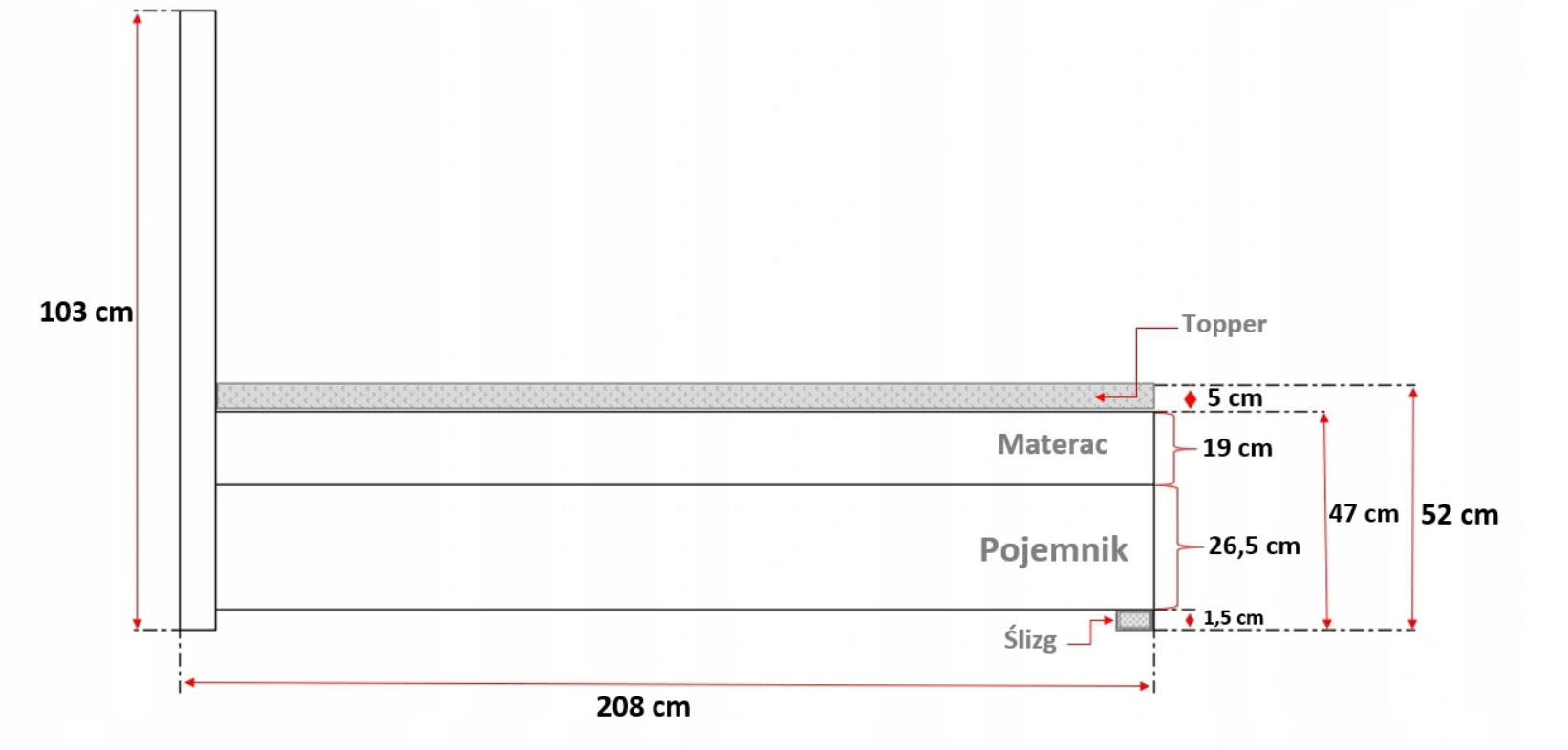 Łóżko posiada ok. 5 cm topper skonstruowany z wysokoelastycznej pianki. Idealne dopasowanie do ciała niweluje większość problemów dotyczących kręgosłupa oraz sprawia, że sen staje się jeszcze bardziej regenerujący. Dzięki pikowanemu pokrowcowi możemy w dowolnym momencie odświeżyć topper, piorąc pokrowiec w temperaturze do 40°C.