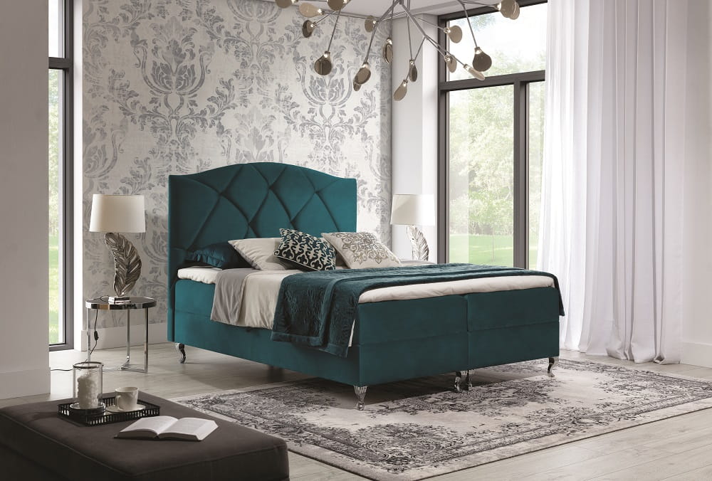 Model MARLON to niekwestionowany TOP łóżek w stylu glamour. Dzięki charakterystycznemu pikowaniu zagłówka oraz oryginalnym "lwim" nóżkom zyskujemy łóżko niesamowicie nowoczesne. W zestawieniu z welurowymi tkaninami lub w obiciu z ekoskóry będziemy mogli jeszcze bardziej podkreślić jego eleganckie wykończenie, gdzie opływowy zagłówek doskonale współgra z giętymi nóżkami, tworzą harmonijną całość.