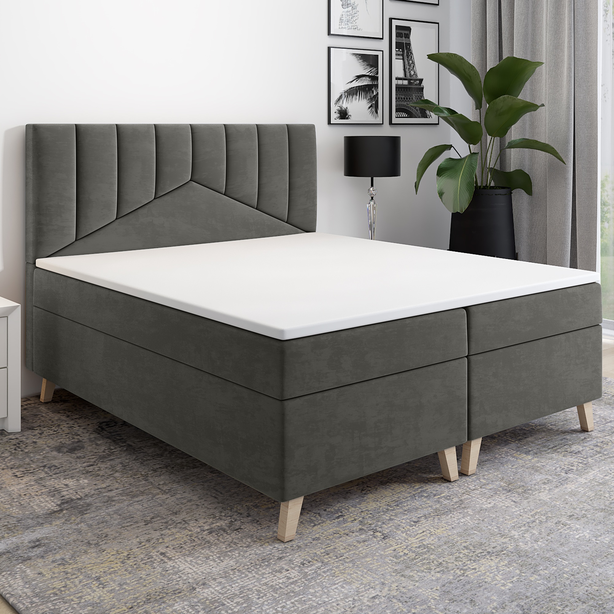 Eleganckie łóżko kontynentalne WIWA, to połączenie nowoczesnego designu i wyjątkowego komfortu snu. Tapicerowane miękką, przyjemną w dotyku tkaniną, doskonale wpisuje się zarówno w minimalistyczne, jak i bardziej klasyczne aranżacje sypialni. Stylowe, geometryczne przeszycia zagłówka nadają całości charakteru i podkreślają jego ekskluzywny wygląd.