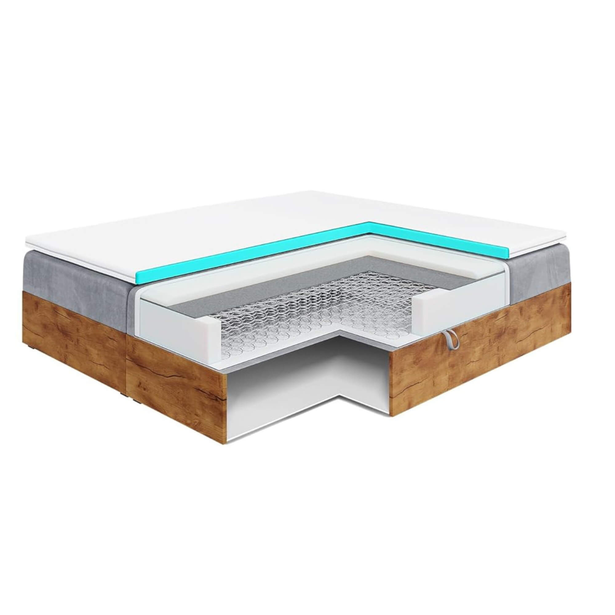 Mebel ten wyposażono w dwa pojemniki na pościel, które zapewniają dodatkową przestrzeń do przechowywania. Wbudowany materac bonellowy gwarantuje solidne podparcie dla ciała oraz komfortowy sen.