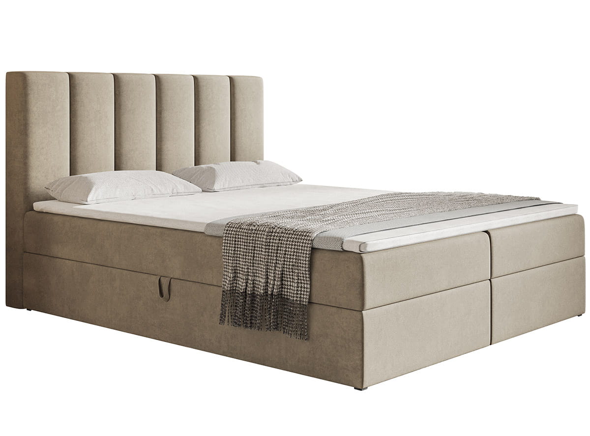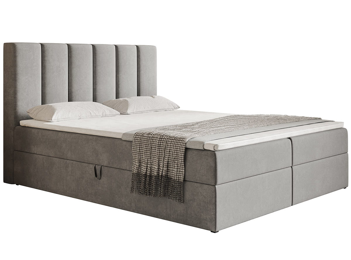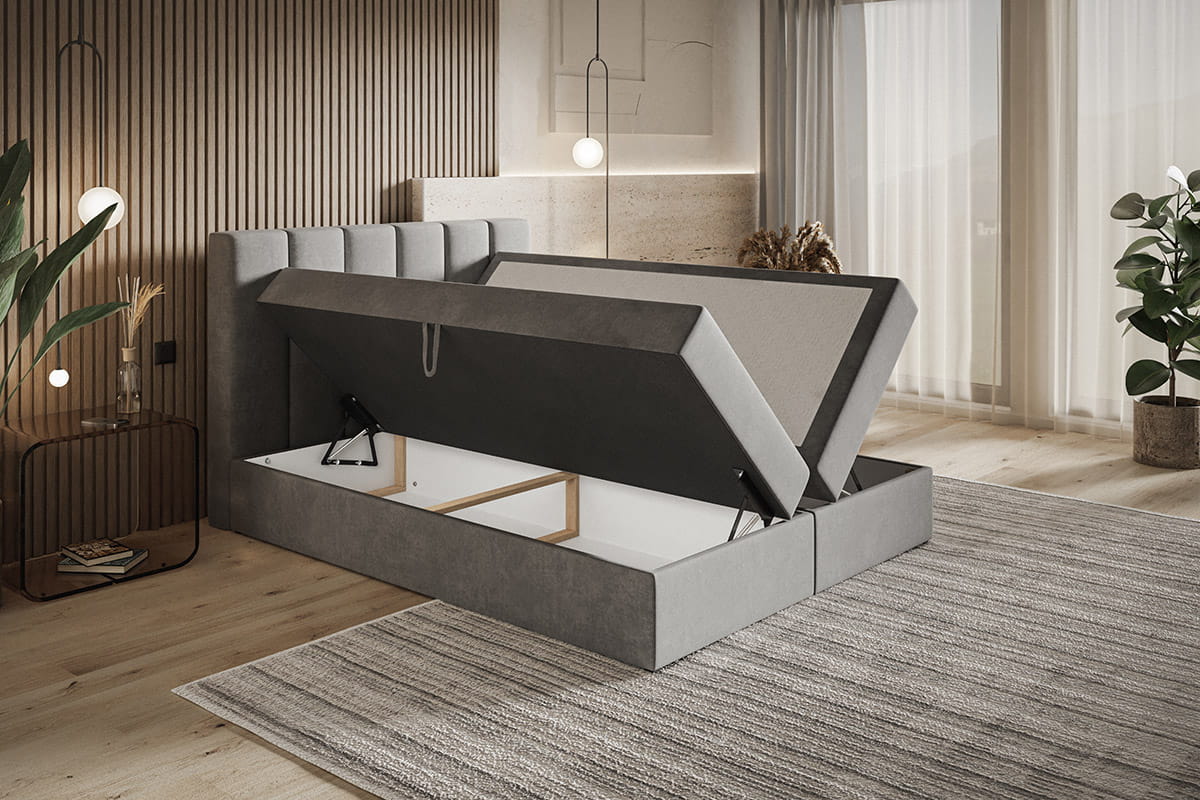 Łóżko kontynentalne BOKS 1 zostało wyposażone w dwa funkcjonalne pojemniki na pościel, wysoki zagłówek oraz materac z możliwością wyboru sprężyn. Skrzynia otwiera się za pomocą podnośników sprężynowych oraz automatów, co łagodzi potrzebę użycia siły do otwierania i zamykania pojemnika.Wymiary: