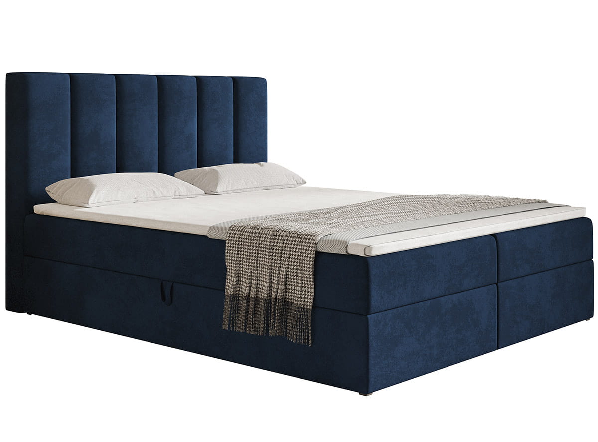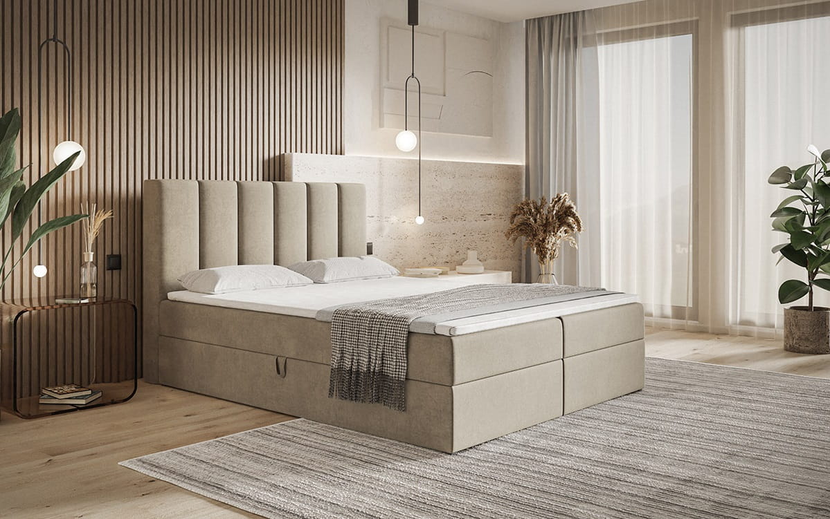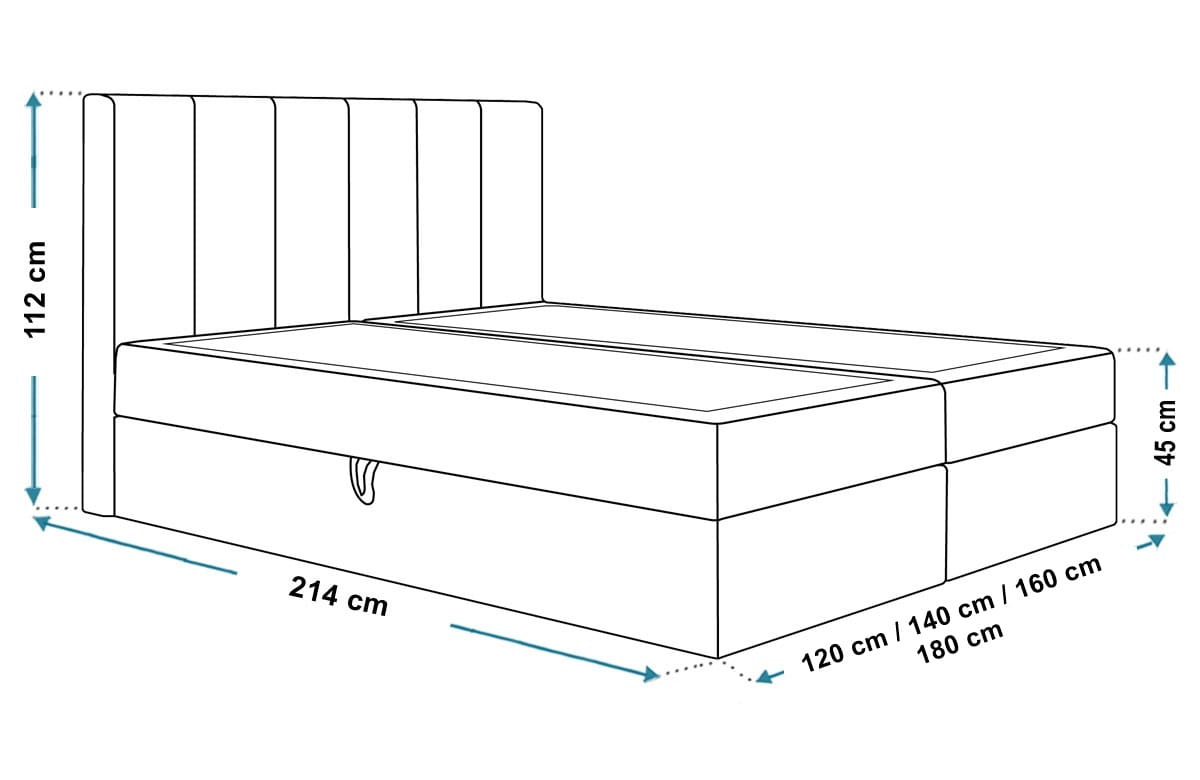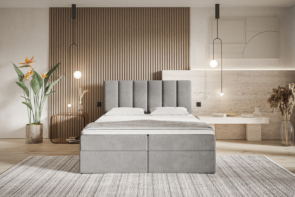 Łóżko kontynentalne BOKS 1 zostało wyposażone w dwa funkcjonalne pojemniki na pościel, wysoki zagłówek oraz materac z możliwością wyboru sprężyn. Skrzynia otwiera się za pomocą podnośników sprężynowych oraz automatów, co łagodzi potrzebę użycia siły do otwierania i zamykania pojemnika.Wymiary: