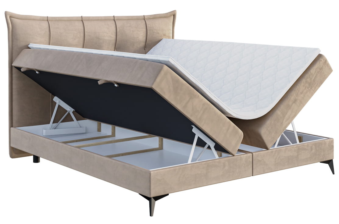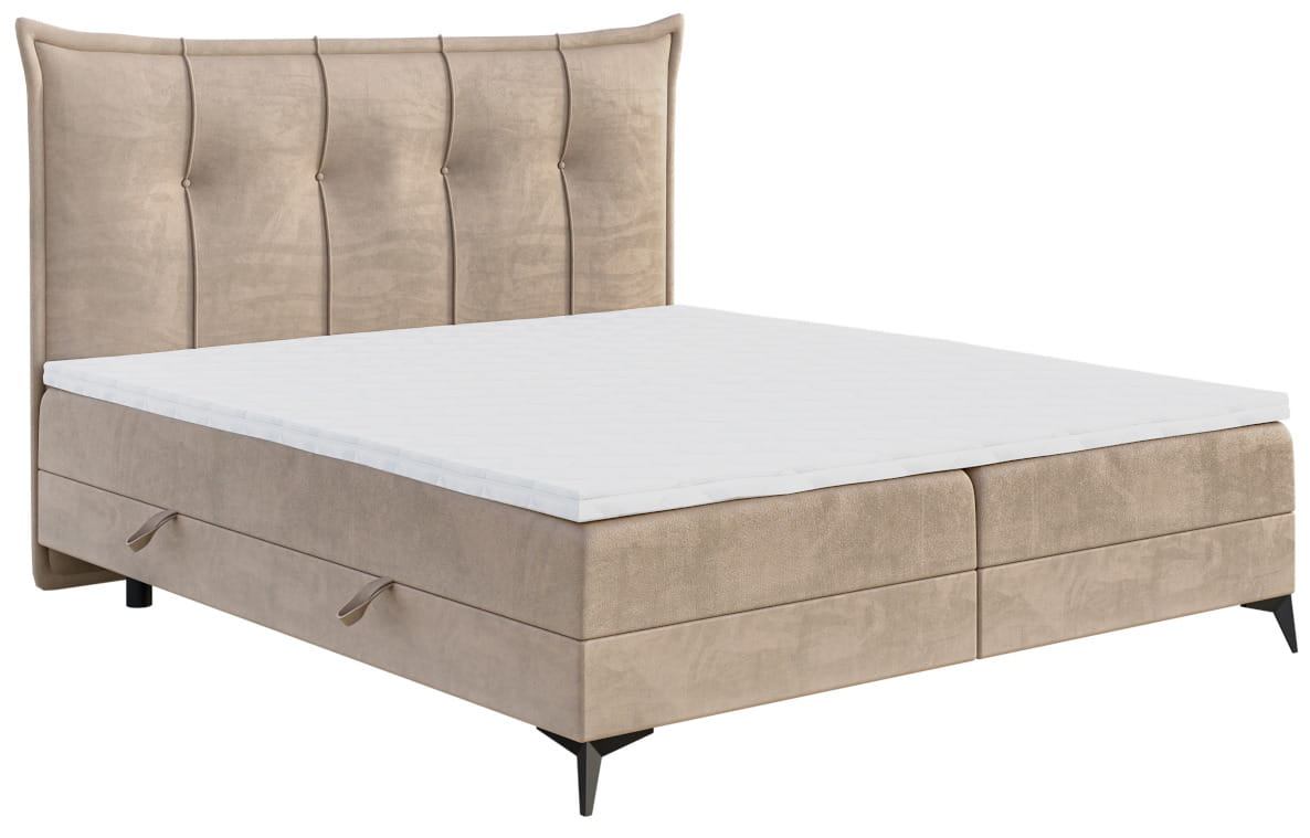 Znakiem rozpoznawczym FOXY jest bogato zdobione wezgłowie z unikalnie zniekształconą na bokach ramą. Przeszycia z guzikami w kolorze tkaniny obiciowej staną się integralnym dodatkiem, urozmaicającym wnętrze. Wzniesienie konstrukcji na nóżkach nadaje jej lekkości, jakieś brakuje boxspringom. Tak jak w przypadku standardowych modeli sprężyny osadzono w skrzyni, zabezpieczono pianką oraz warstwą wierzchnią zwaną topperem. Jeżeli pragniesz zrezygnować z materaca bonellowego, istnieje możliwość jego zamiany na opcje z pojedynczymi sprężynami kieszeniowymi.