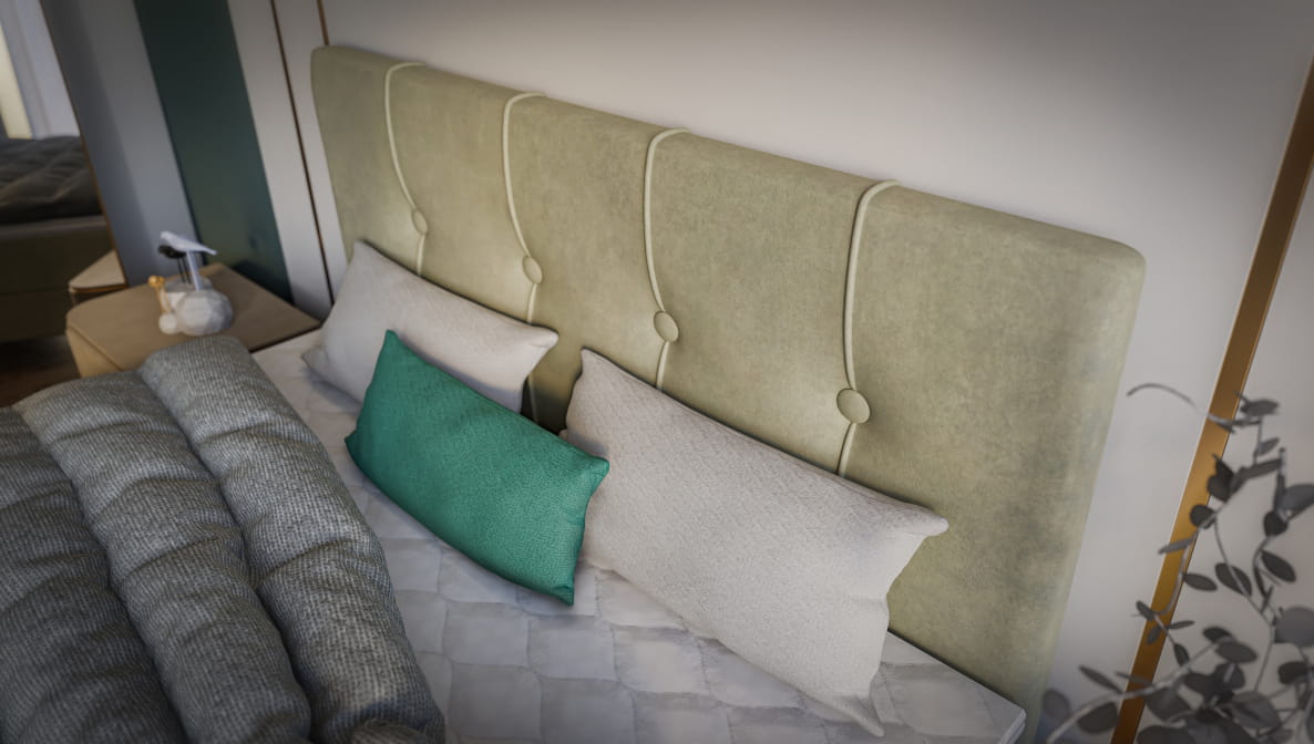 - wezgłowie przeszywane w pionie oraz pikowane dużymi guzikami o średnicy 5 cm w tkaninie z korpusu