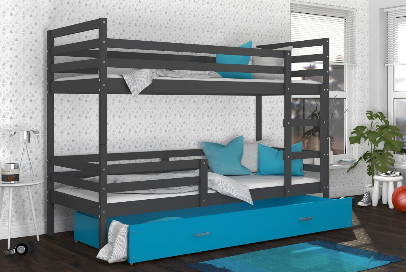 Łóżko piętrowe JAREK 160x80 gwarantuje bezpieczny i komfortowy sen dziecka w pokoju dziecięcego. Pojemna szuflada daje możliwość dodatkowego miejsca do przechowywania. Stabilna konstrukcja mebla zapewnia bezpieczne użytkowanie. Łóżko piętrowe zostało pomalowane ekologicznymi farbami, które są bezpiecznie dla dzieci.