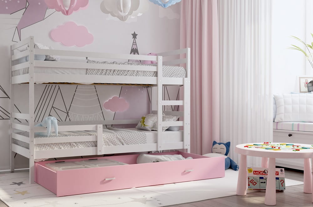 Łóżko piętrowe JAREK 190x80 gwarantuje bezpieczny i komfortowy sen dziecka. Pojemna szuflada daje możliwość dodatkowego miejsca do przechowywania w pokoju dziecięcym. Stabilna konstrukcja mebla zapewnia bezpieczne użytkowanie. Łóżko piętrowe zostało pomalowane ekologicznymi farbami, które są bezpiecznie dla dzieci.