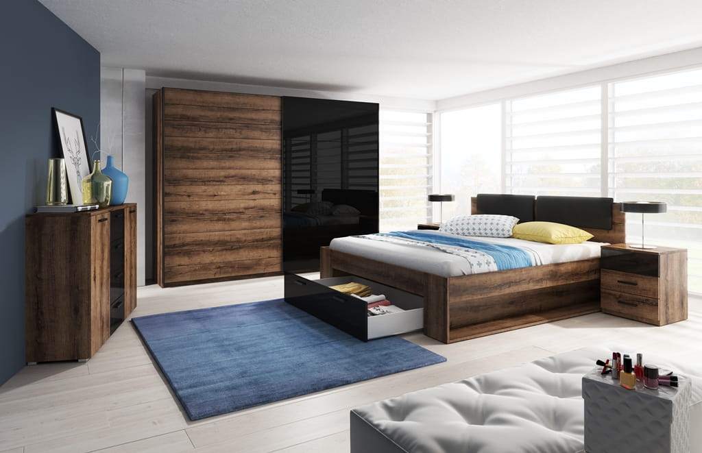 Kolekcja mebli GALAXY stworzona z myślą o tworzeniu komfortowej oraz praktycznej sypialni. Są to meble, które zachwycą swym wykonaniem każdego posiadacza, a wyraziste wybarwienie doda uroku i ciepła aranżacji. Kolekcja utworzona jest z łóżka oraz szafy w trzech rozmiarach, stolika nocnego i komody. Meble wykonane są z wysokiej jakości płyty laminowanej w kolorze dąb monastery + czarny połysk. Idealnie wkomponują się w nowoczesne oraz loftowe pomieszczenie.