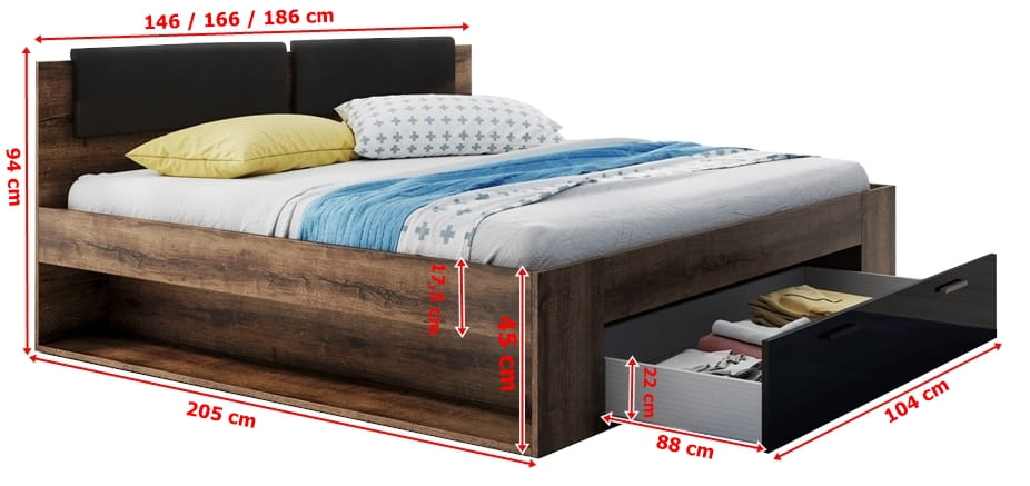 Łóżko zostało wykonane z płyty laminowanej o grubości 20 mm wykończonej okleiną ABS. Łoże produkowane jest w 3 rozmiarach do wyboru: 140x200/160x200/180x200. Bryła wyposażona jest w pojemną szufladę na pościel, dzięki której zyskać można dodatkową przestrzeń do przechowywania. Na zagłówku umieszczone zostały dwa tapicerowane panele w czarnym kolorze. Dla wygodnego i efektywnego odpoczynku zalecamy dokupić materac [LINK], który sprawi iż spędzanie na nim czasu będzie przyjemniejsze.