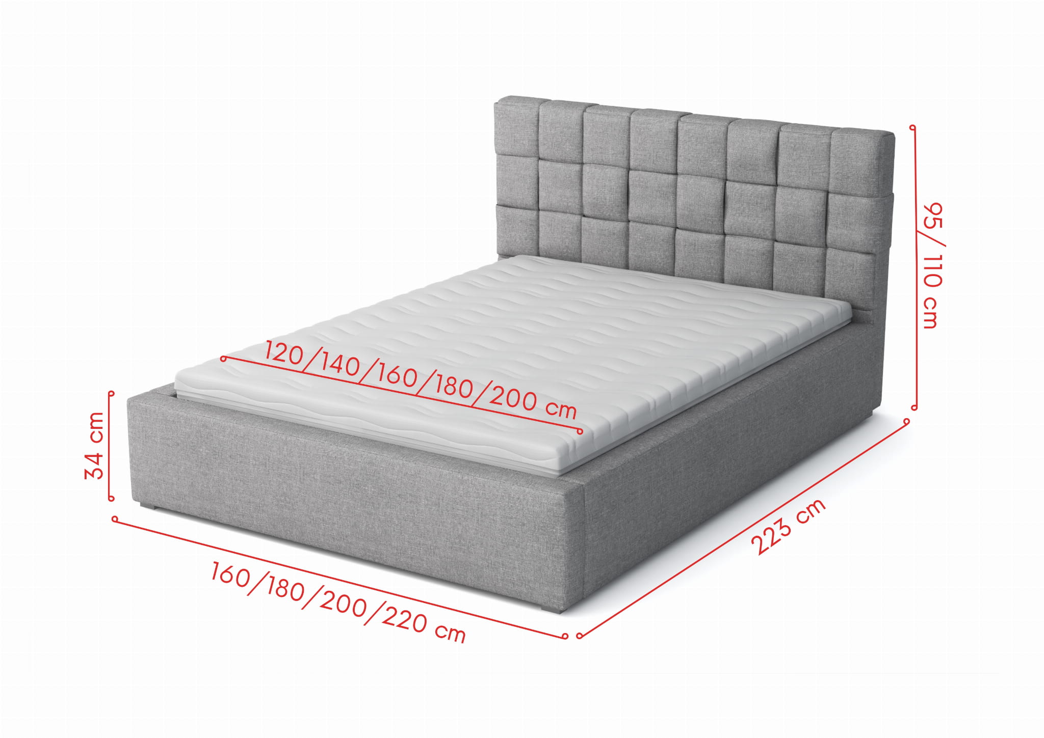 - wezgłowie dostępne w dwóch wersjach: standardowej o wysokości 95 cm lub podwyższonej 110 cm