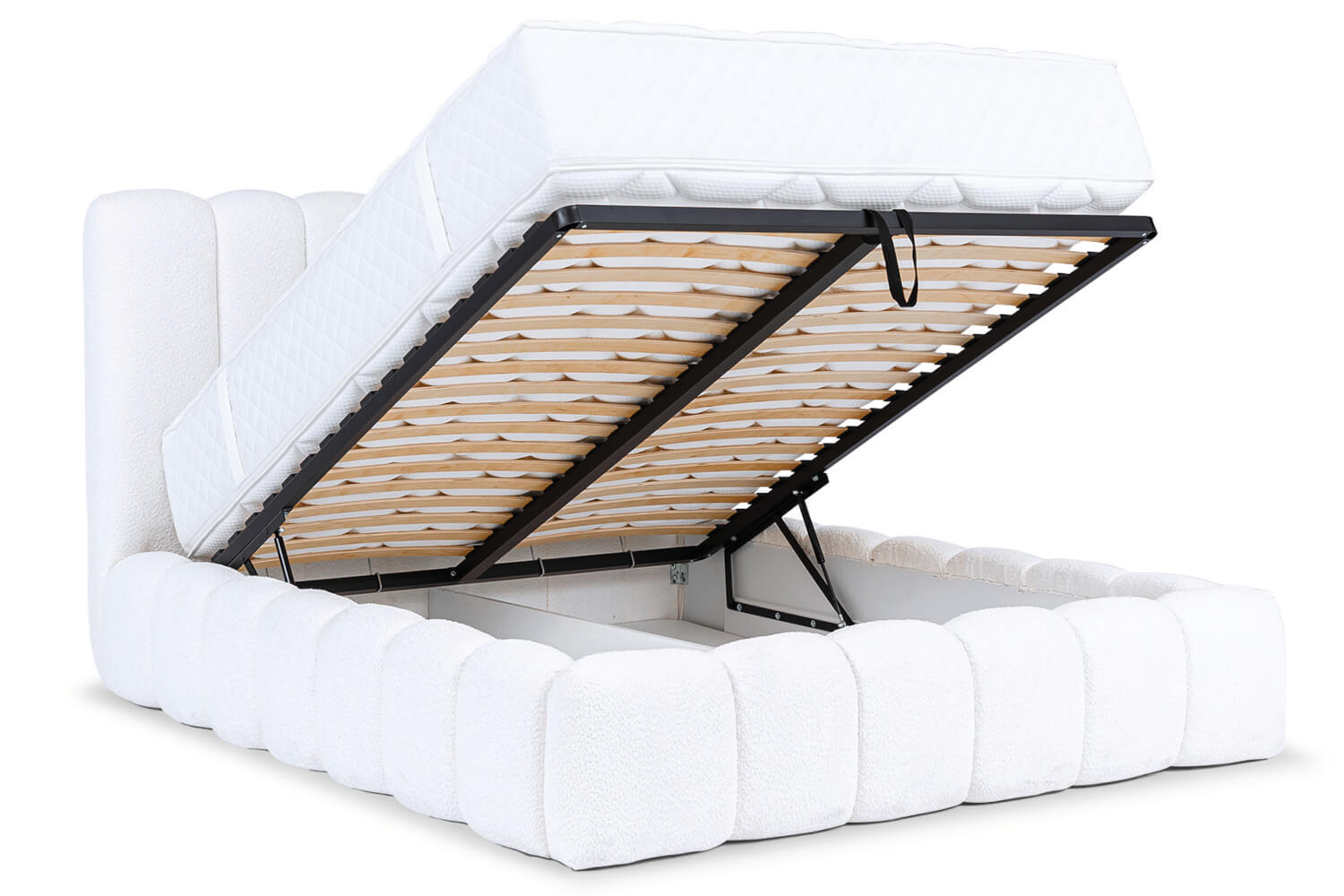Łóżko zostało wyposażone w solidny stelaż z listwami sprężynującymi, co zapewnia komfortowy sen i odpowiednie wsparcie dla materaca. Metalowa rama z trwałym stelażem gwarantuje wytrzymałość i stabilność konstrukcji. Pojemnik na pościel stwarza dodatkową przestrzeń do przechowywania, co jest szczególnie przydatne w mniejszych pomieszczeniach. Do łóżka dokupisz wygodny materac oraz designerskie stoliki.