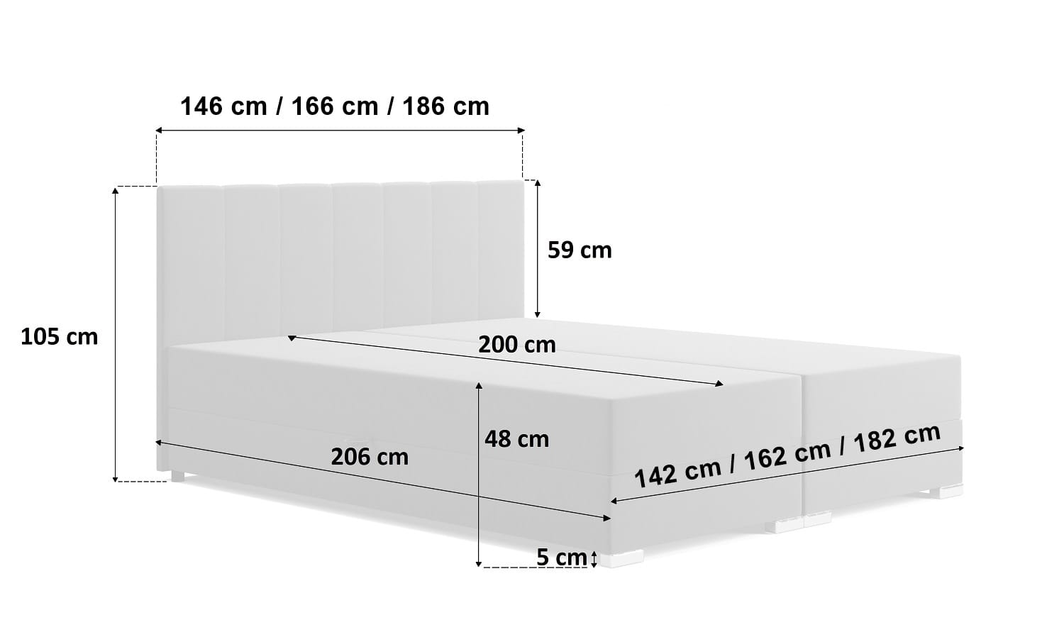 - szerokość całkowita: 146 cm / 166 cm / 186 cm